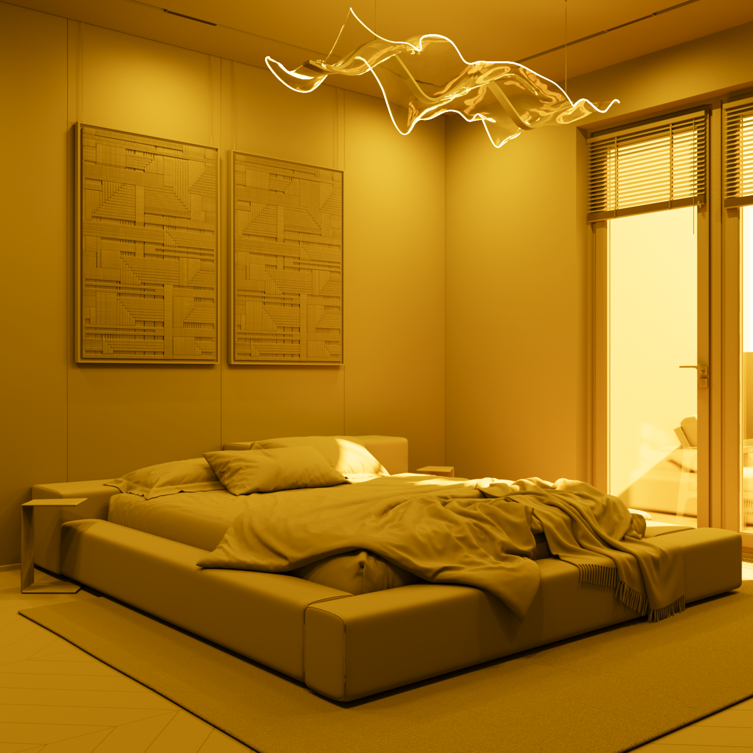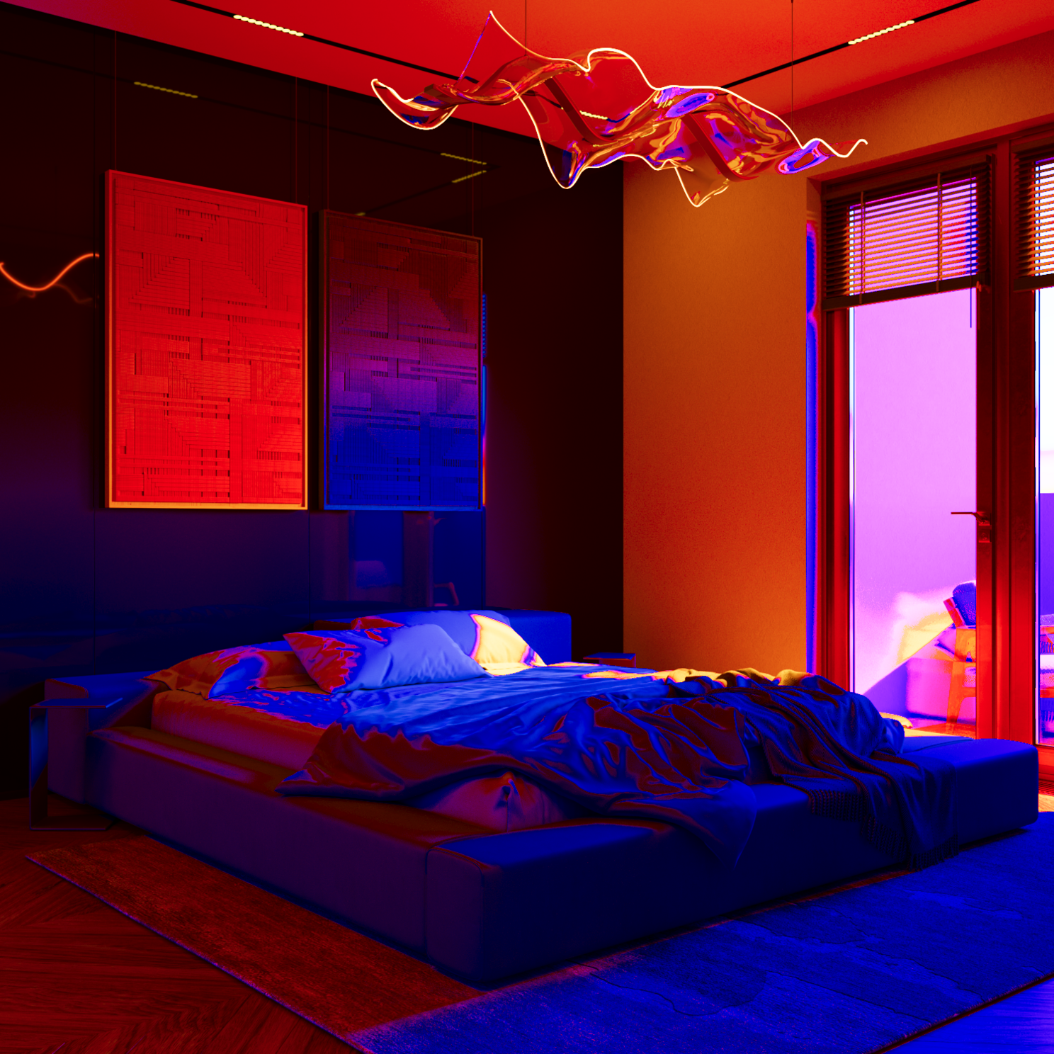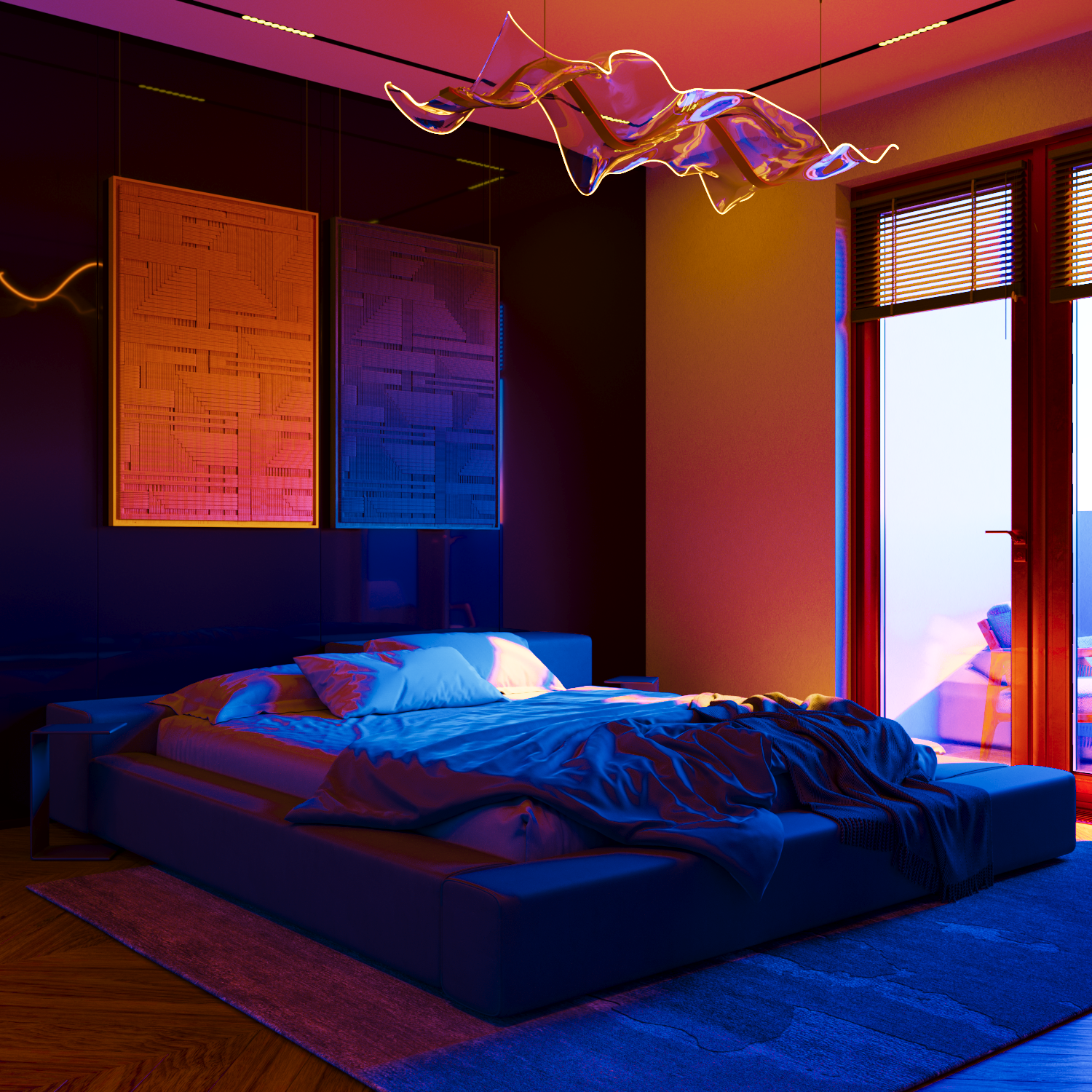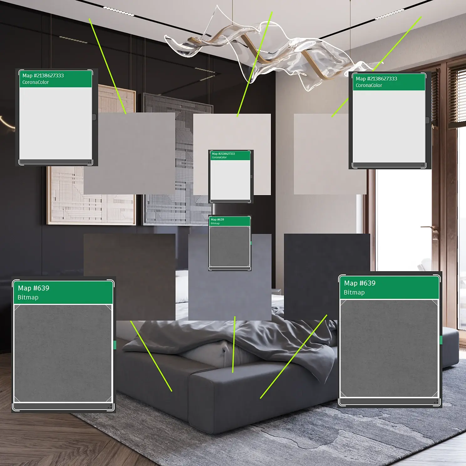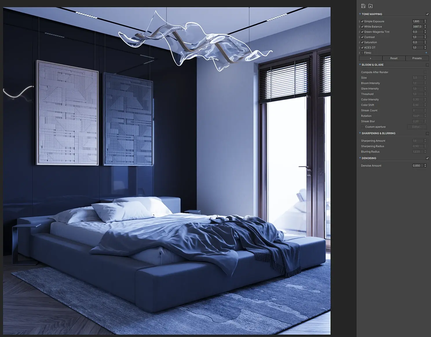 В таком случае, на итоговой визуализации достаточно мест, где материал комнаты освещен холодным, теплым, и смешанным светом. Так же, по яркости (экспозиции) кадра, в нем есть и места глубоких теней, и достаточно сильно засвеченные участки, что позволяет полнее раскрыть материал.