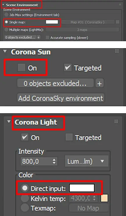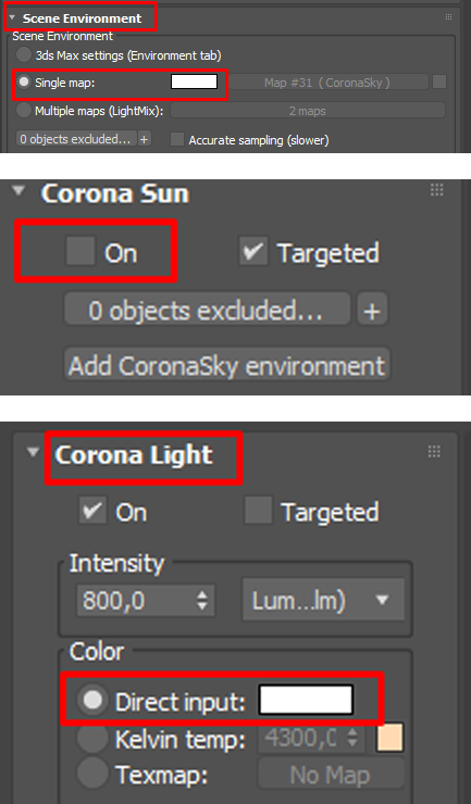 Важно. Старайтесь учитывать светоперенос, при настройке света. Общее понимание о том, светлый ли у вас интерьер, или тёмный, вы поймете из вашего технического задания, так как в подавляющем большинстве случаев лицевые отделочные материалы и формируют львиную долю характера светопереноса.