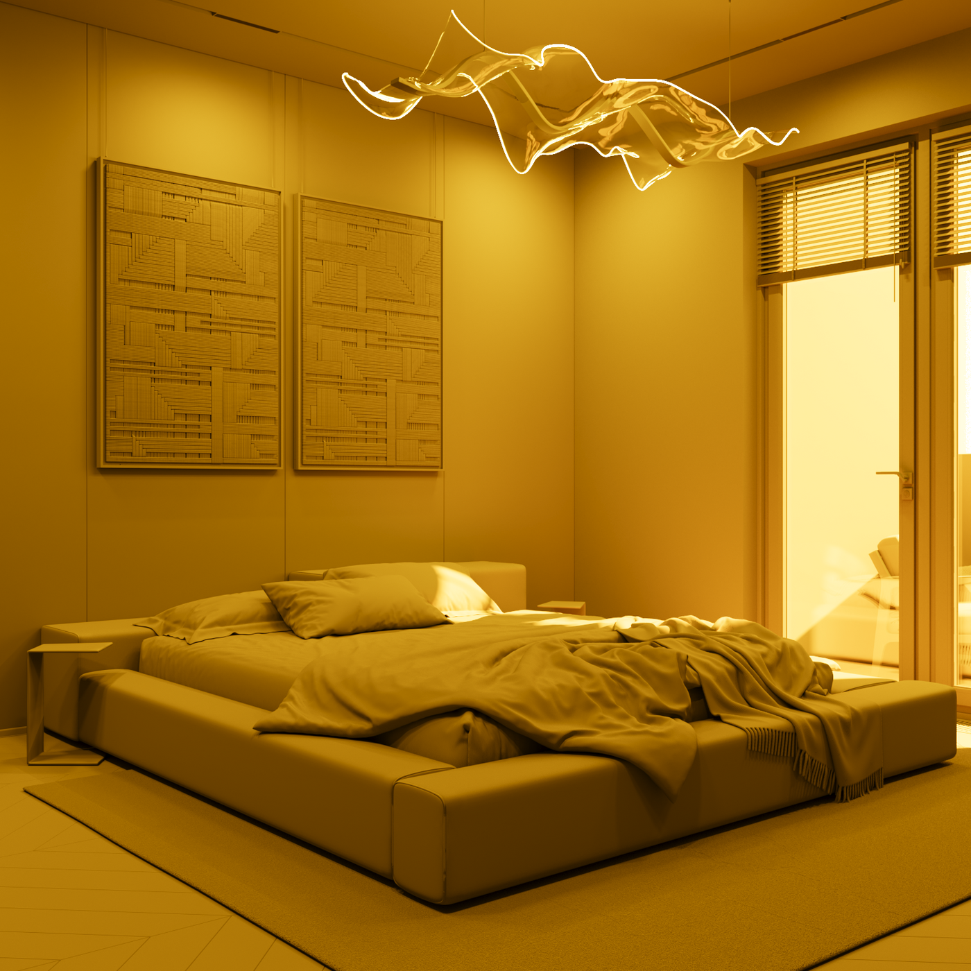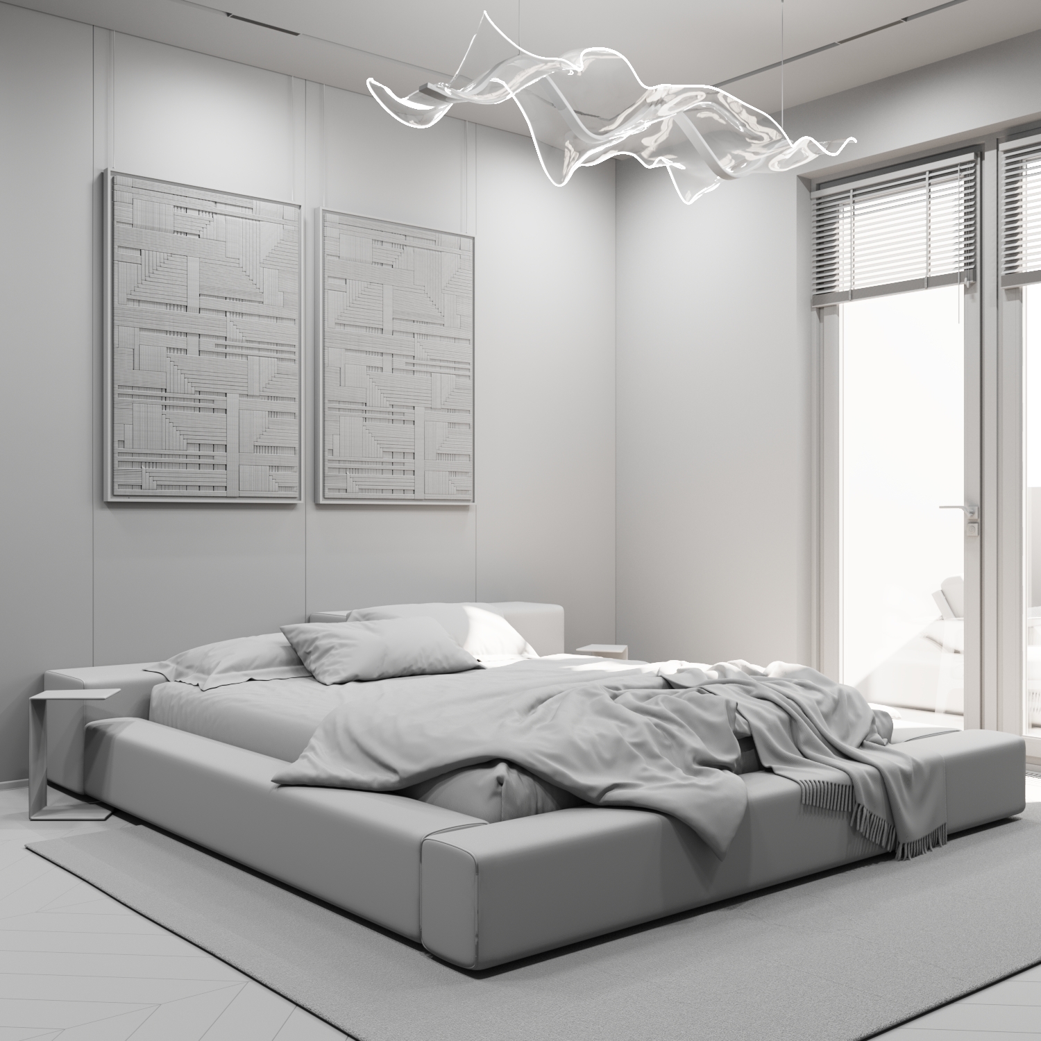 Для начала я покажу вам только геометрию сцены, а все свойства материалов будут заменены на единый материал. Светильники в интерьере я оставлю неизменными по интенсивности, но заменю их "цвет" на белый. Временно исключим влияние "цвета" естественного освещения, оставив только чисто белый свет от окружения. Направление света будет задаваться только положением оконного проема, и его размером. Да, оно тоже важно, и способно задавать свое настроение по светотеневому рисунку, но пока это опустим.