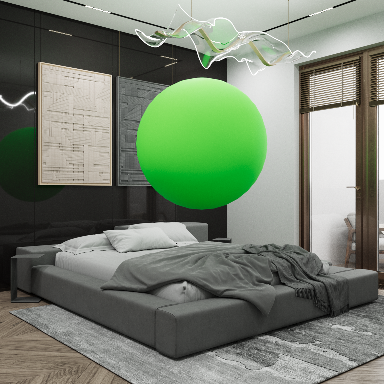 Причем, обратите внимание, что то, как блуждают цвета по картинке (помещению), в первую очередь зависит от светопереноса. Вот что будет если этот шар оставить таким же по насыщенности зеленого, но убрать яркость. Именно она, в первую очередь, влияет на то, как цвет будет мигрировать в стороны от объекта/поверхности: