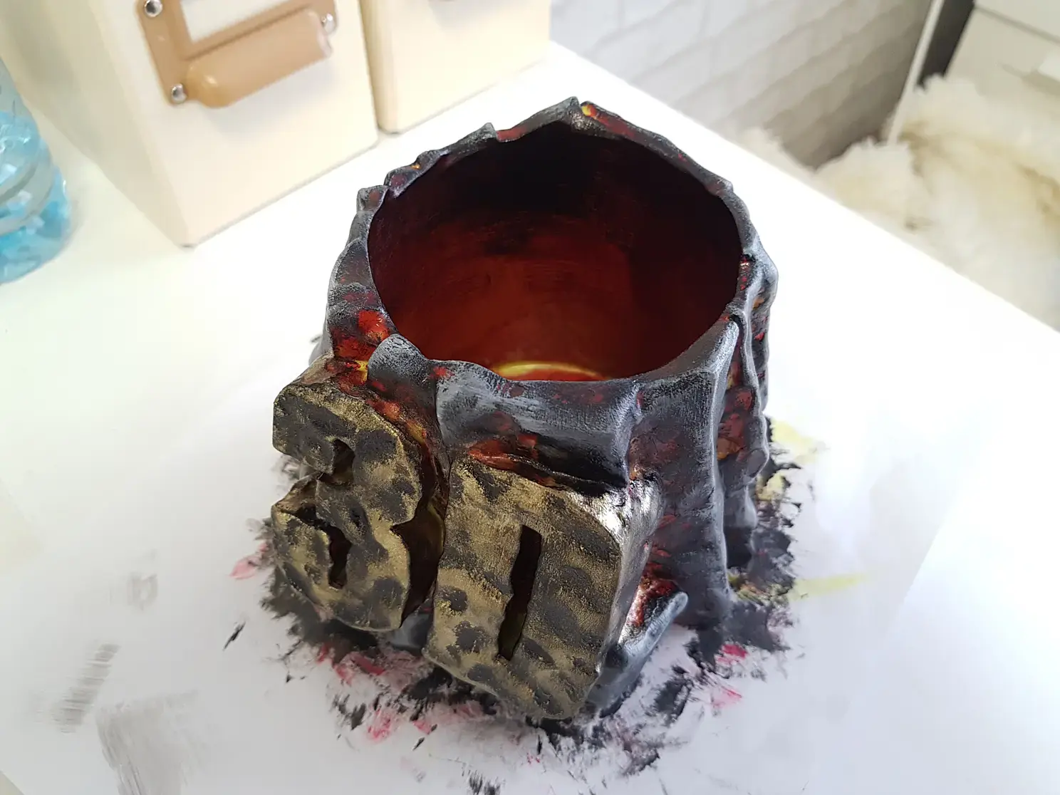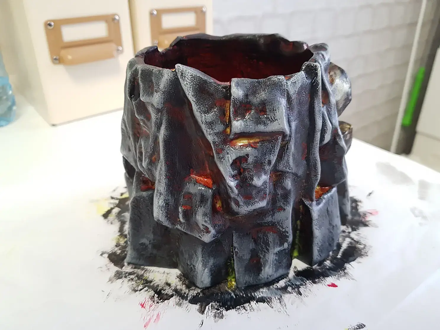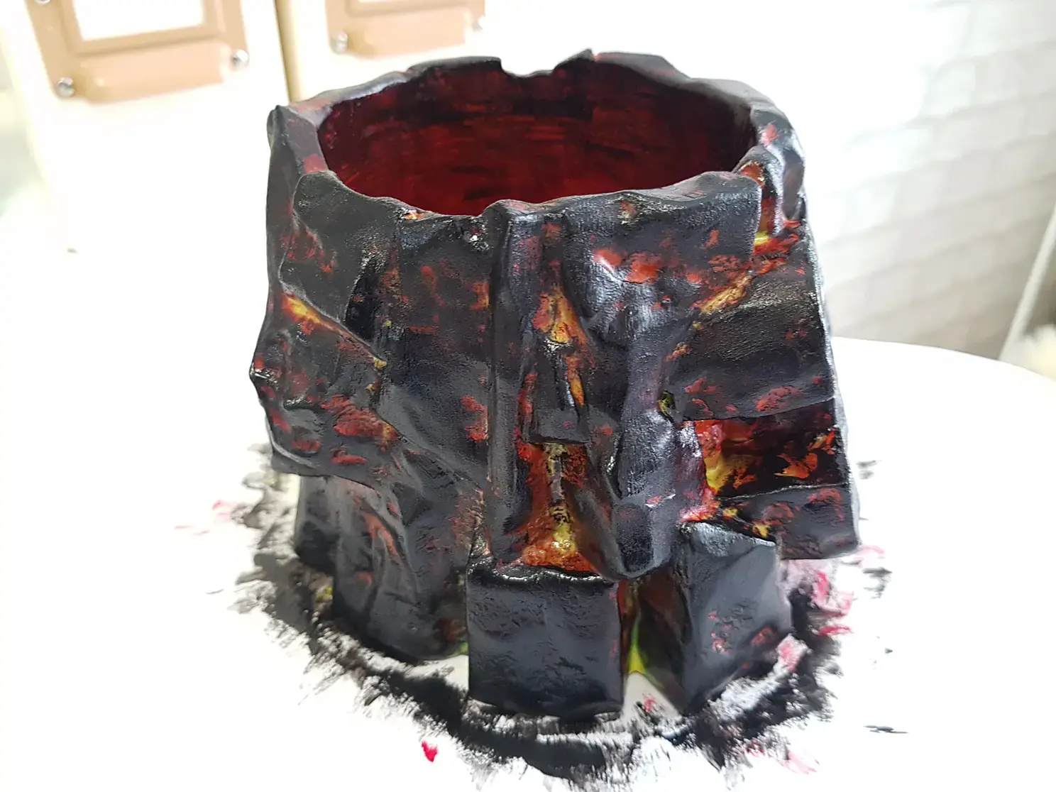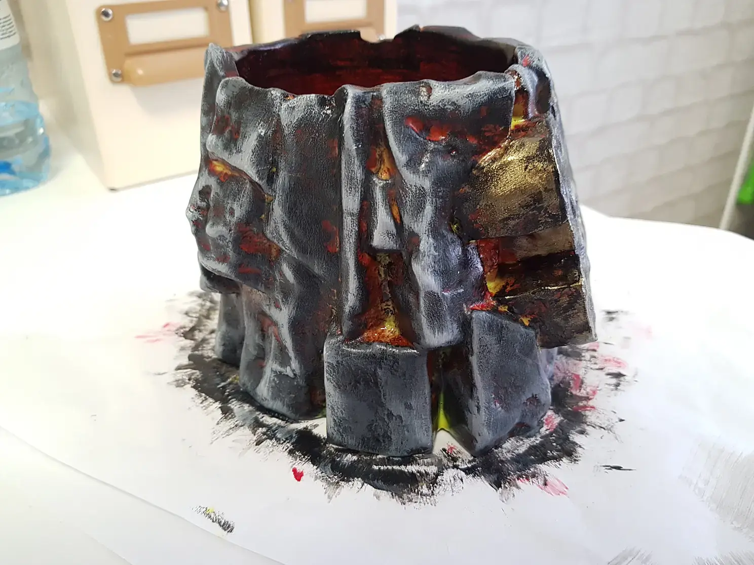 Когда просо слой грунтовки наношу базовую краску. В данном случае черную и флуоресцентную красную. Красная нужна для эффекта огня в разломах камня. Краску, после грунта можно использовать любую, даже на растворителях, до пластика она уже не доберется.