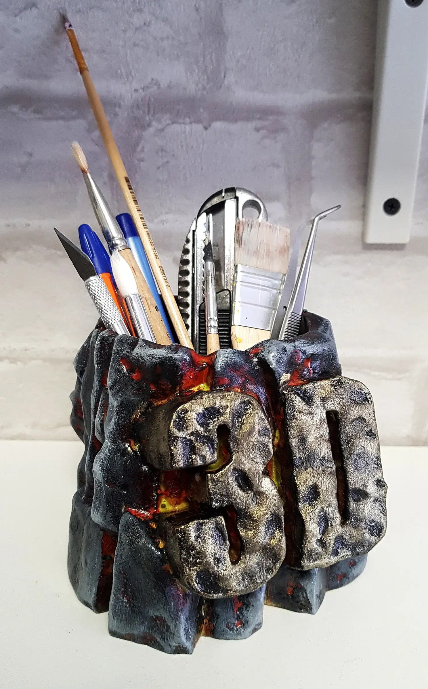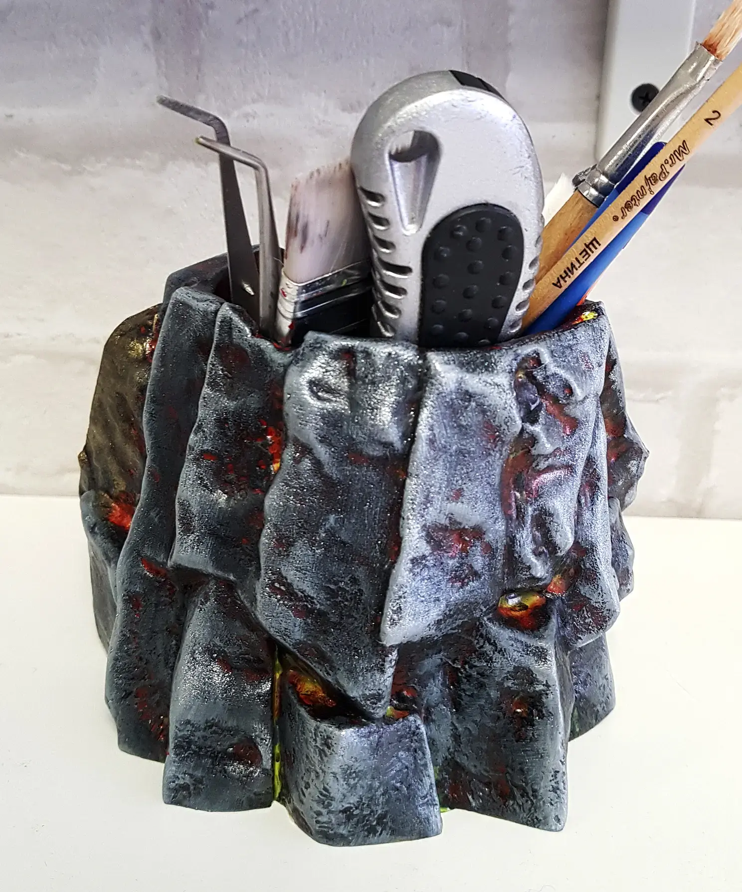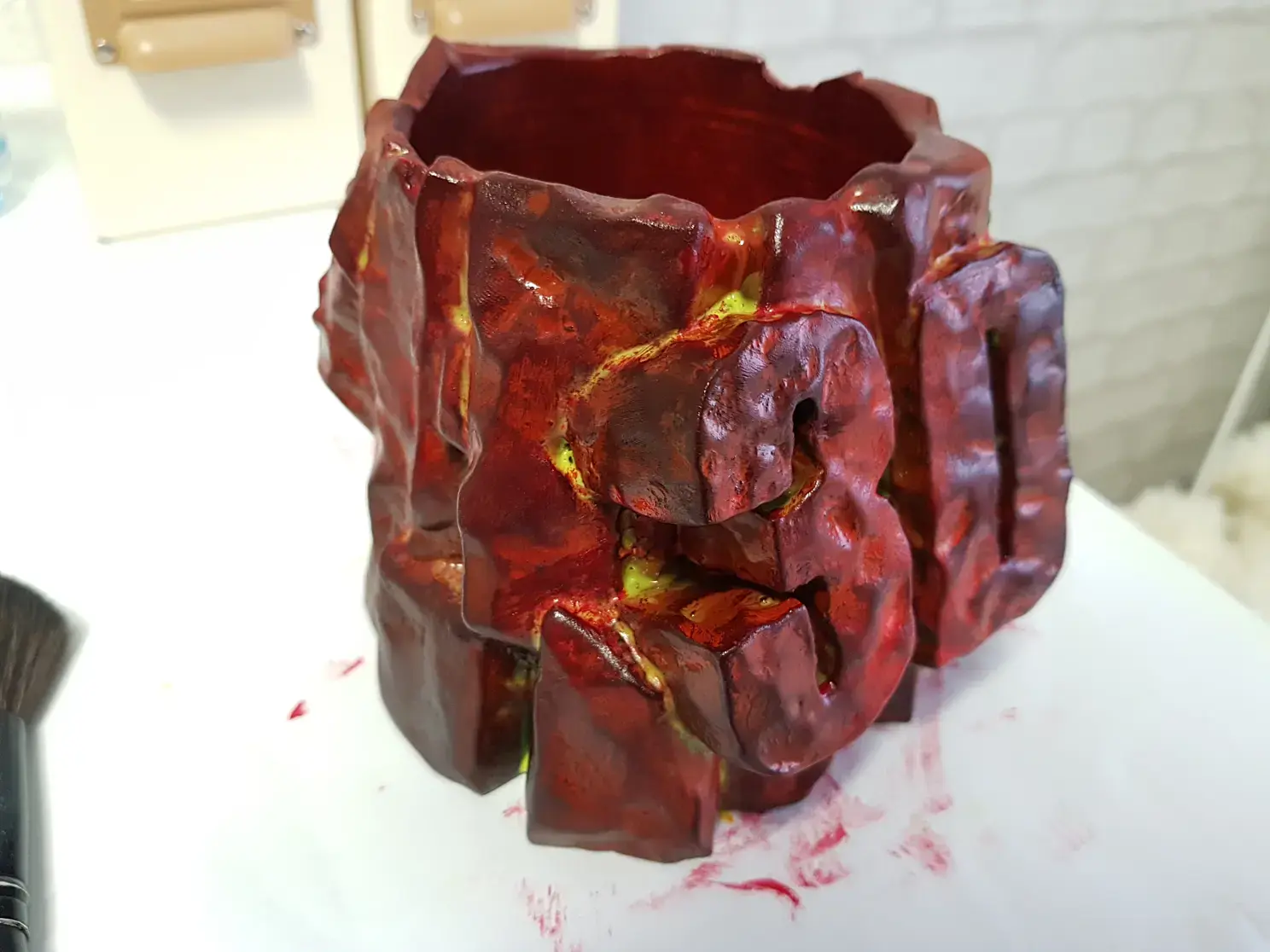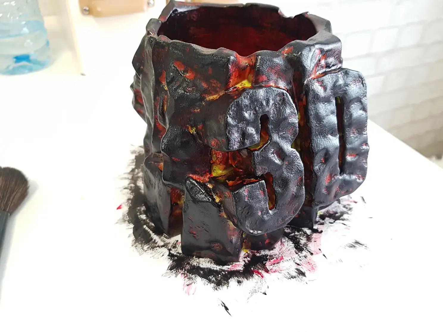 Когда просо слой грунтовки наношу базовую краску. В данном случае черную и флуоресцентную красную. Красная нужна для эффекта огня в разломах камня. Краску, после грунта можно использовать любую, даже на растворителях, до пластика она уже не доберется.