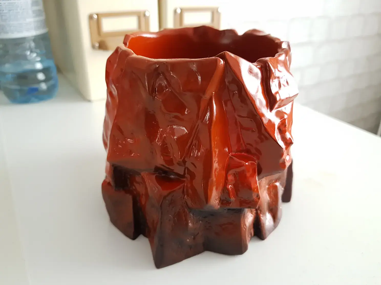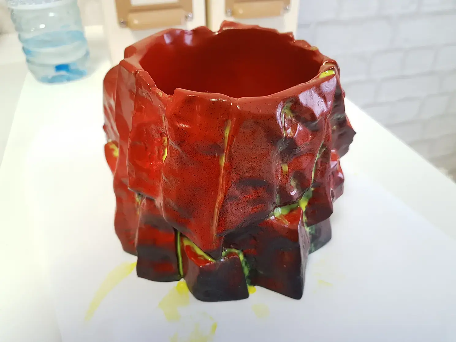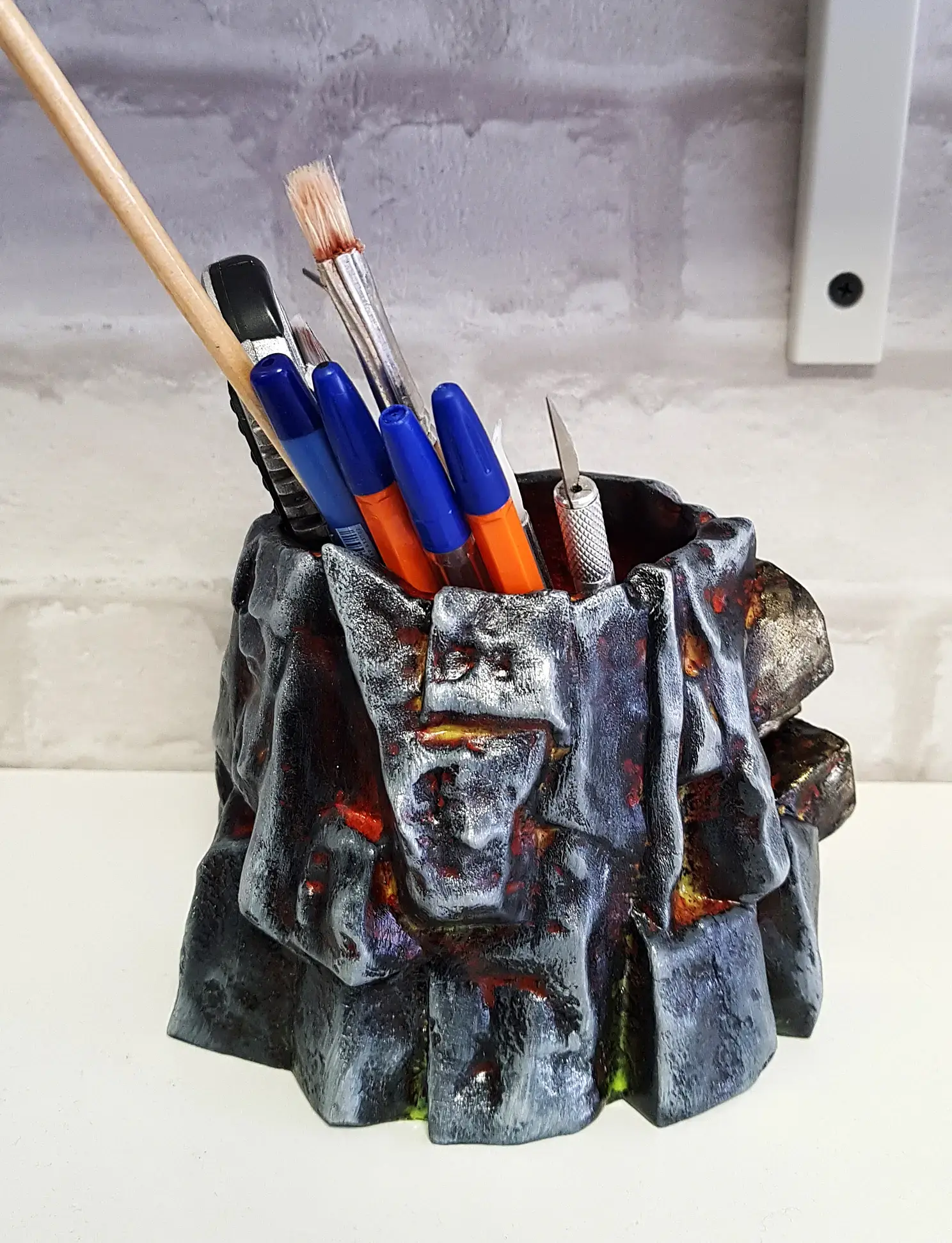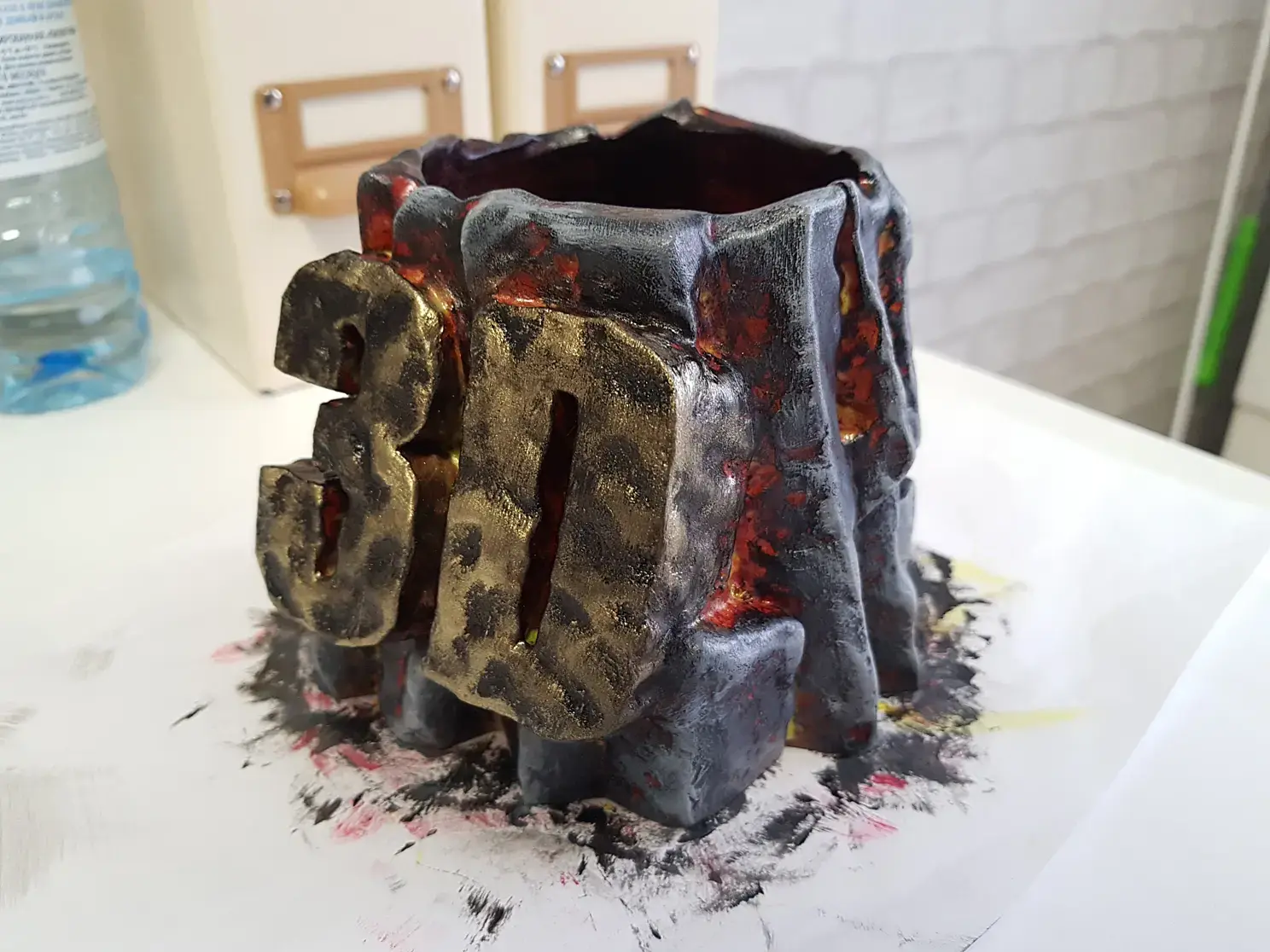 Когда просо слой грунтовки наношу базовую краску. В данном случае черную и флуоресцентную красную. Красная нужна для эффекта огня в разломах камня. Краску, после грунта можно использовать любую, даже на растворителях, до пластика она уже не доберется.