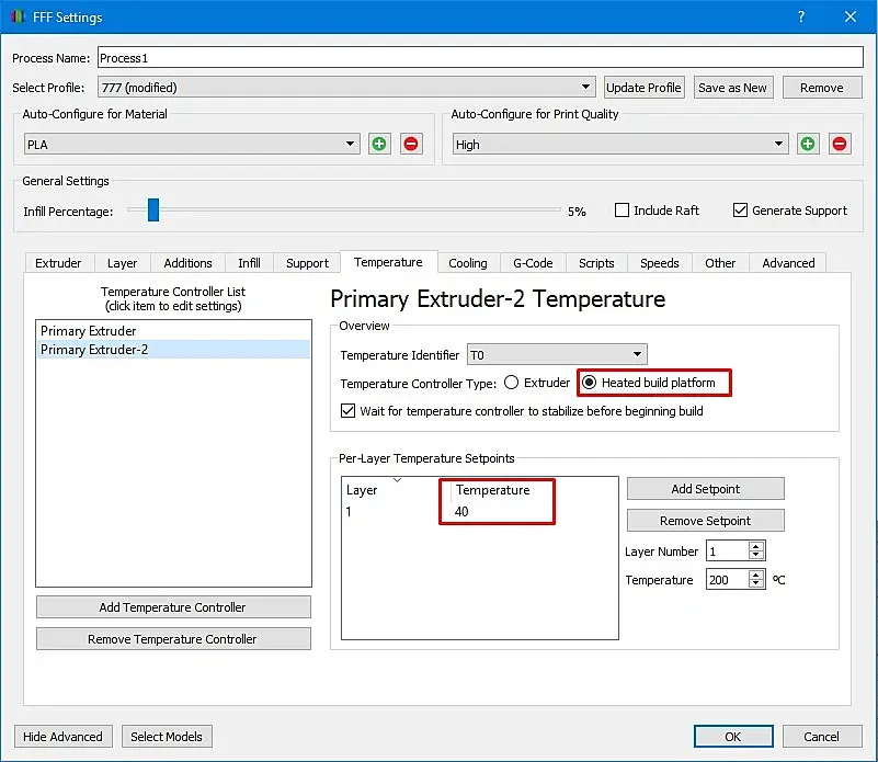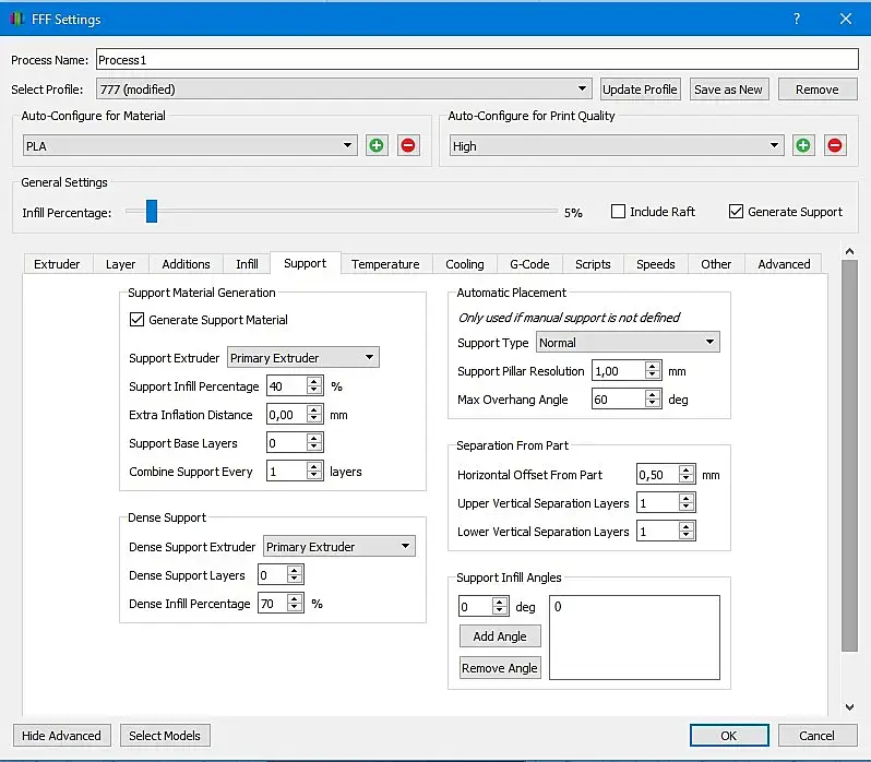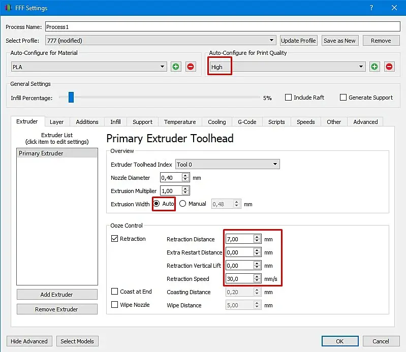 Печатаю я на принтере Ender-3 пластиком PLA и соплом 0,4 мм. Ниже приведу скрины основных настроек Simplify 3D. Настройке (на моем принтере и на моем пластике) работают отлично!