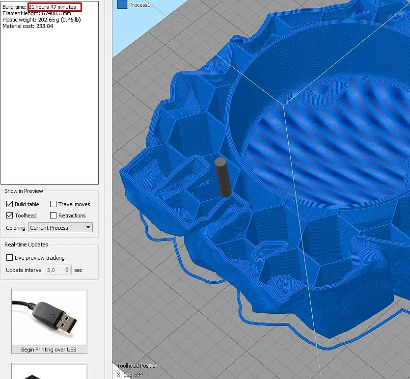 Программа показывает примерное время печати 21 час 47 минут, но в реальности было 25 часов.