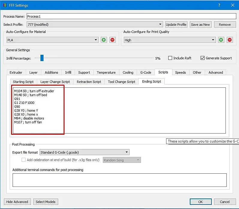 Стоит у меня вот такой интересный скрипт. В конце печати он уводит стол, приподымает бошку и выключает обдув. Полезная вещь!