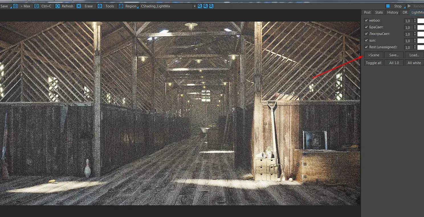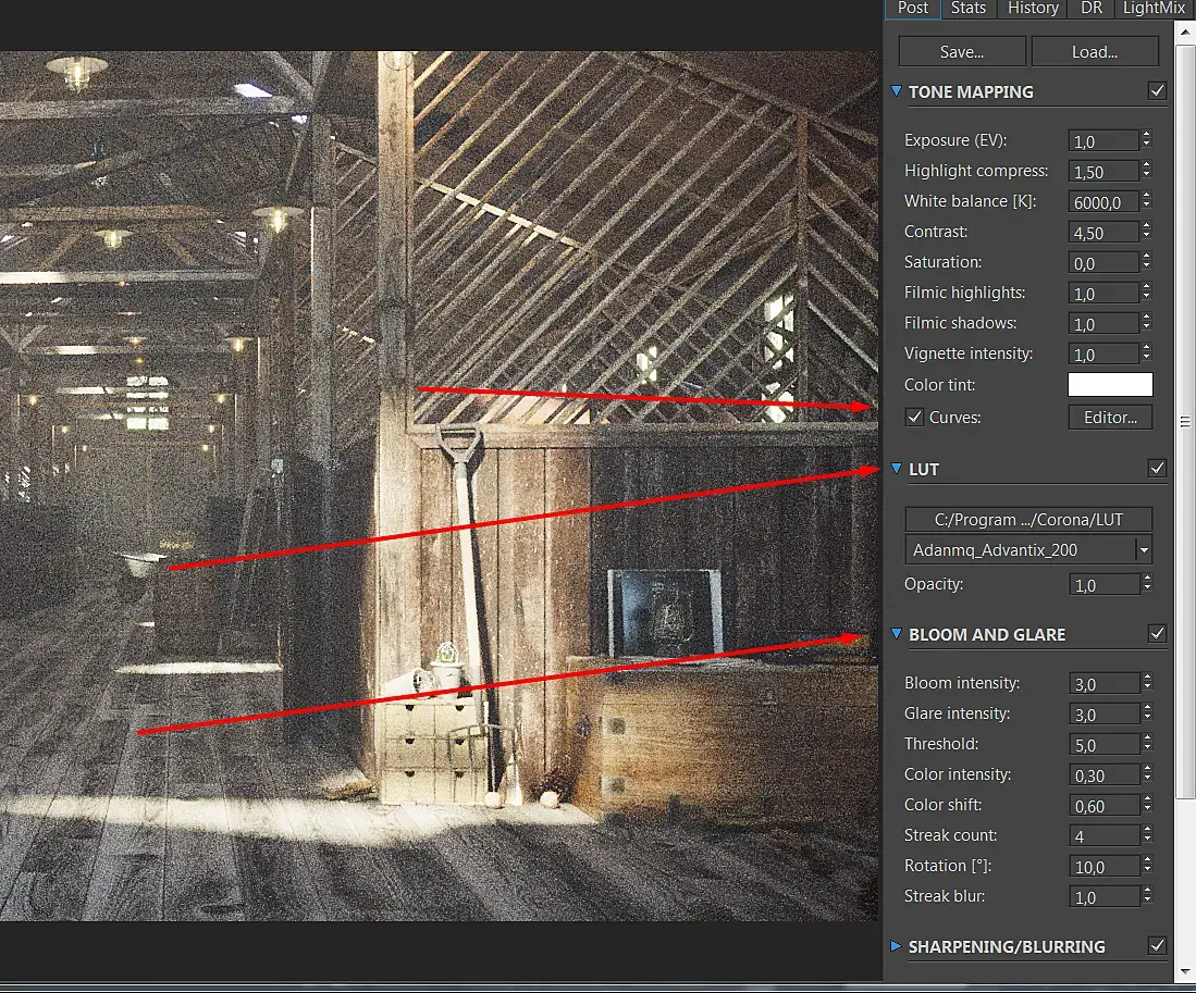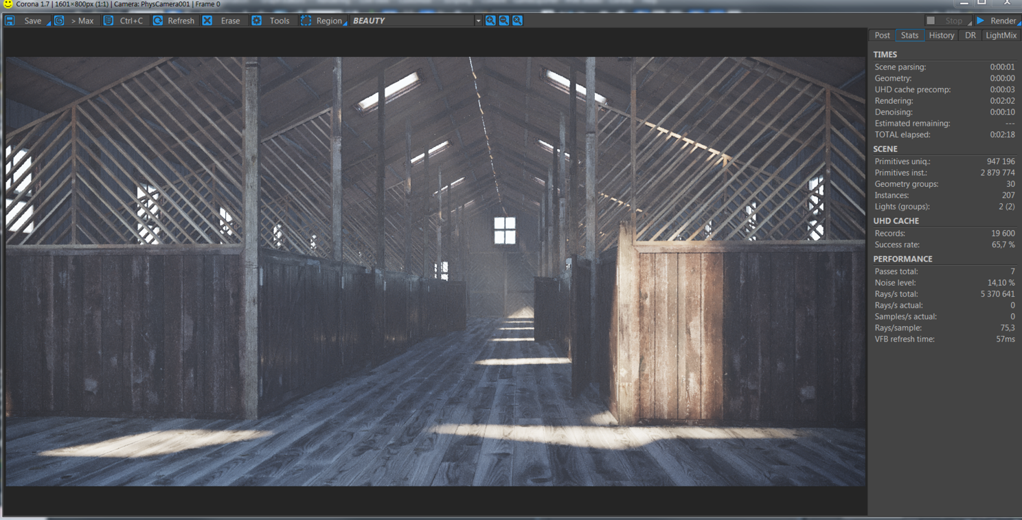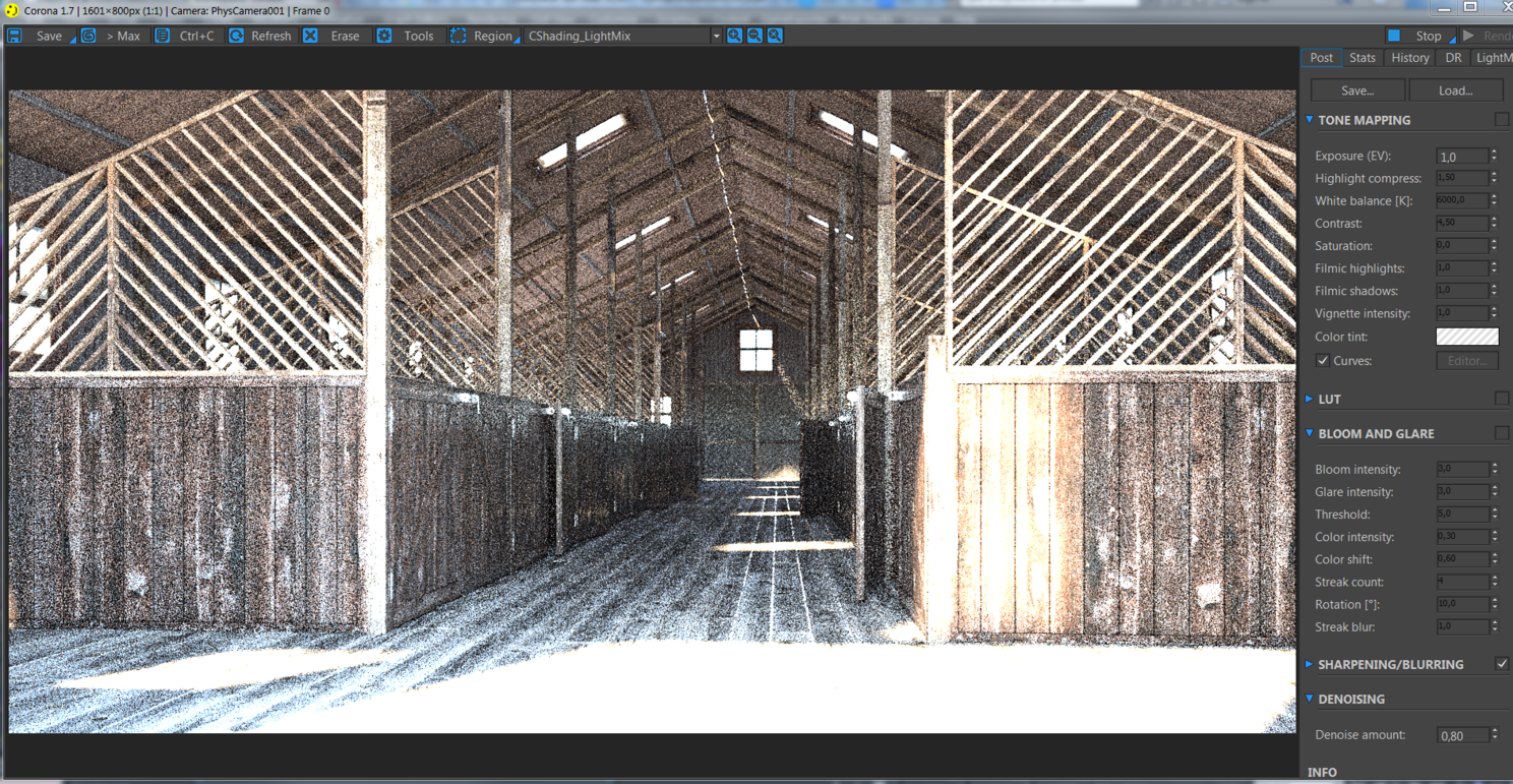 Следующий этап это построение объема. От большего к меньшему не особо задумываясь о деталях.Строим каркас конюшни , расписывать процесс моделинга я не буду скажу лишь то что для создания досок используйте FloorGenerator. Причем 80% того что есть на данном скрине сделано именно им FloorGenerator- работает очень просто и я думаю его используют практически все визуализаторы так что нет смысла в рассмотрении данного плагина. Вот мы наконец то набросали объем и возникает вопрос а что собственно дальше? Вариантов не много, можно моделировать детали и наполнять сцену либо уже начинать ставить свет. Я предпочитаю свет настраивать в начале проекта и периодически вносить коррективы. И так мы работаем в Короне а значит процесс постановки освещение прост.Нам не надо расставлять порталы, не надо крутить кучу настроек и тестить часами добиваясь нормального результата. Просто ставим CoronaSun и жмем на кнопку Добавить Корона Скай в ОкружениеПараметр Size делаем по вкусу у меня в данном случае 8. Но в экстерьерной сцене это было слишком много и я его снизил до 2. Второй этап это настройка ЛайтМикса .Жмем F10 и в закладке Scene нажимаем Setup LightMix.Все вы настроили))) В элементах появились слои с Небом и Солнцем.Так как я делал проект в Короне 1.6 то использовал PhysCamera а значит Макс установит по умолчанию свою экспозицию и вы не сможете изменять ее так как вам надо. Просто отключаем ееДелаем тестовый рендер и получаем такое Шум, засветы смотреть больно)))) А значит нам надо все это настроить. Включить Денойз, настроить экспозицию и выставить все параметры так как подсказывает интуиция. По сути нет идеальных настроек на каждый случай. Всегда надо потратить время на поиски подходящей комбинации))) Но есть те параметры с которых можно начинать.Немного доработав геометрию( добавил ворота на входе) делаю очередной тест и настраиваю все параметры кроме LUT Curves и BLOOM к ним мы вернемся позже. И так....Объем есть, свет есть но нет Крастоы)))Все плоское, бездушное.Давайте добавим воздуха. Добавляем в редактор материалов CoronaVolumMtlи перетаскиваем в GlobalVolumMtlПараметров универсальных по сути нет.Все зависит от сцены,экспозиции и освещения.У меня получились именно такие настройки. В экстерьерной сцене они другие, в подвале тоже хотя подвал в этой же сцене. Считаем....Дымка есть, объем есть а красоты нет)))) Но мы руки не опускаем. Что нужно для хорошей картинки ? Правильно детализация и освещение. Значит добавляем деталей и ставим свет.Сено пока не трогаем, расставляем модели примерно так выглядит результат Если с деталями все ясно то с ИС надо разобраться.Часто люди в Короне используют Лайтматериал как ИС и это ошибка. Первое в чем проблема это шум, вторая проблема это гибкость.Нам надо Люстры и бра сделать красивыми, а значит сделать им спираль в лампочке но освещать должен обычный ИС.Сам ИС должен быть чисто белым. Возникает вопрос почему же белым? А дело в том что мы будем в ЛайтМиксе менять цвет и переносить его на ИС. Так же выключить ему отражения, и тени.Вот параметрыРасставляем все ИС, разбиваем на группы и в ручную вносим в ЛайтМикс Теперь с помощью Лайтмикса настраиваем освещение .Яркость,цвет после чего желательно с помощью кнопки Scene перенести все в слой BEAUTY (когда закончите настраивать)Далее переходим в закладку Post и добавляем штрихов.Опять же тут все по вкусу и по ситуации. LUT выбираем банальным