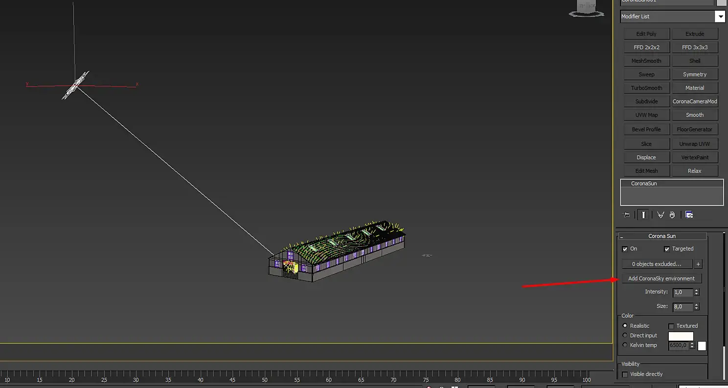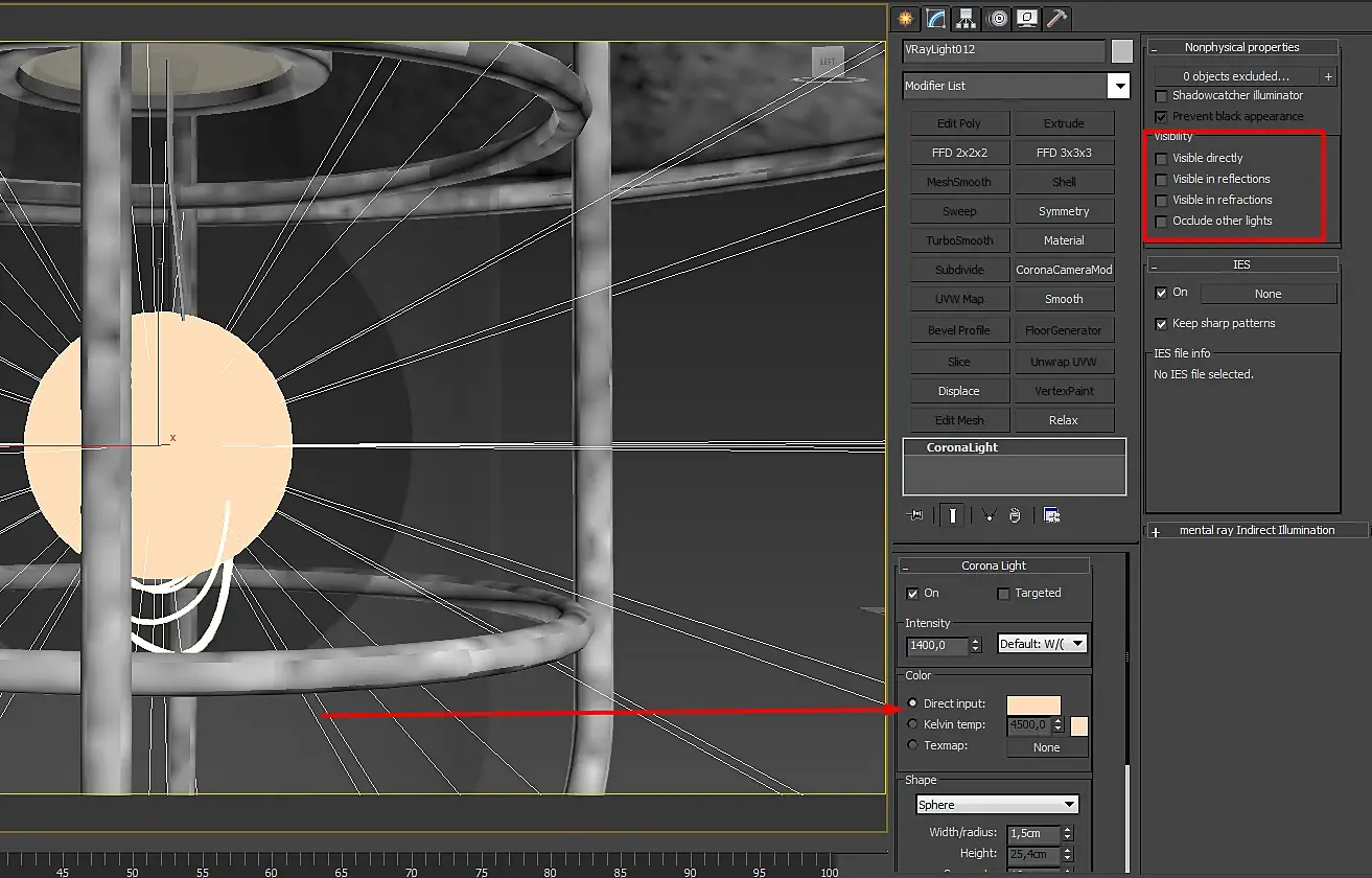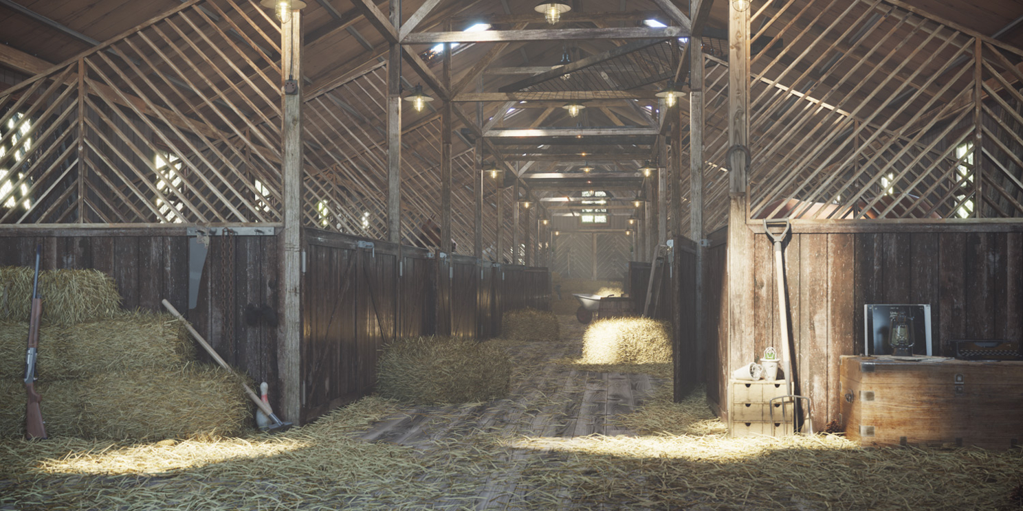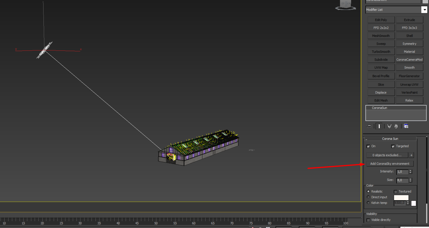Следующий этап это построение объема. От большего к меньшему не особо задумываясь о деталях.Строим каркас конюшни , расписывать процесс моделинга я не буду скажу лишь то что для создания досок используйте FloorGenerator. Причем 80% того что есть на данном скрине сделано именно им FloorGenerator- работает очень просто и я думаю его используют практически все визуализаторы так что нет смысла в рассмотрении данного плагина. Вот мы наконец то набросали объем и возникает вопрос а что собственно дальше? Вариантов не много, можно моделировать детали и наполнять сцену либо уже начинать ставить свет. Я предпочитаю свет настраивать в начале проекта и периодически вносить коррективы. И так мы работаем в Короне а значит процесс постановки освещение прост.Нам не надо расставлять порталы, не надо крутить кучу настроек и тестить часами добиваясь нормального результата. Просто ставим CoronaSun и жмем на кнопку Добавить Корона Скай в ОкружениеПараметр Size делаем по вкусу у меня в данном случае 8. Но в экстерьерной сцене это было слишком много и я его снизил до 2. Второй этап это настройка ЛайтМикса .Жмем F10 и в закладке Scene нажимаем Setup LightMix.Все вы настроили))) В элементах появились слои с Небом и Солнцем.Так как я делал проект в Короне 1.6 то использовал PhysCamera а значит Макс установит по умолчанию свою экспозицию и вы не сможете изменять ее так как вам надо. Просто отключаем ееДелаем тестовый рендер и получаем такое Шум, засветы смотреть больно)))) А значит нам надо все это настроить. Включить Денойз, настроить экспозицию и выставить все параметры так как подсказывает интуиция. По сути нет идеальных настроек на каждый случай. Всегда надо потратить время на поиски подходящей комбинации))) Но есть те параметры с которых можно начинать.Немного доработав геометрию( добавил ворота на входе) делаю очередной тест и настраиваю все параметры кроме LUT Curves и BLOOM к ним мы вернемся позже. И так....Объем есть, свет есть но нет Крастоы)))Все плоское, бездушное.Давайте добавим воздуха. Добавляем в редактор материалов CoronaVolumMtlи перетаскиваем в GlobalVolumMtlПараметров универсальных по сути нет.Все зависит от сцены,экспозиции и освещения.У меня получились именно такие настройки. В экстерьерной сцене они другие, в подвале тоже хотя подвал в этой же сцене. Считаем....Дымка есть, объем есть а красоты нет)))) Но мы руки не опускаем. Что нужно для хорошей картинки ? Правильно детализация и освещение. Значит добавляем деталей и ставим свет.Сено пока не трогаем, расставляем модели примерно так выглядит результат Если с деталями все ясно то с ИС надо разобраться.Часто люди в Короне используют Лайтматериал как ИС и это ошибка. Первое в чем проблема это шум, вторая проблема это гибкость.Нам надо Люстры и бра сделать красивыми, а значит сделать им спираль в лампочке но освещать должен обычный ИС.Сам ИС должен быть чисто белым. Возникает вопрос почему же белым? А дело в том что мы будем в ЛайтМиксе менять цвет и переносить его на ИС. Так же выключить ему отражения, и тени.Вот параметрыРасставляем все ИС, разбиваем на группы и в ручную вносим в ЛайтМикс Теперь с помощью Лайтмикса настраиваем освещение .Яркость,цвет после чего желательно с помощью кнопки Scene перенести все в слой BEAUTY (когда закончите настраивать)Далее переходим в закладку Post и добавляем штрихов.Опять же тут все по вкусу и по ситуации. LUT выбираем банальным