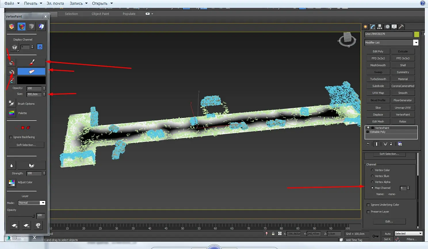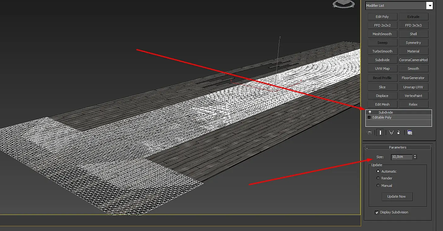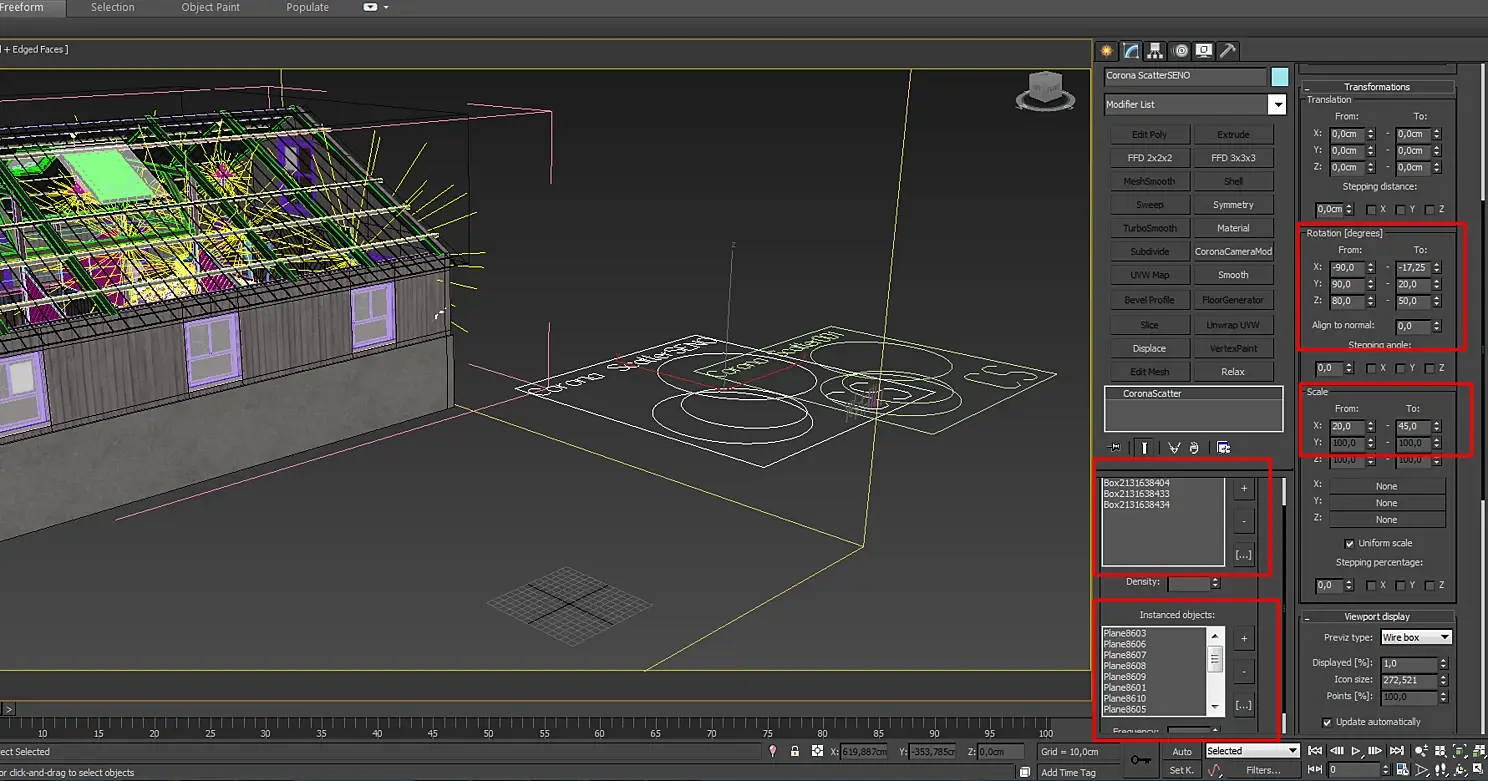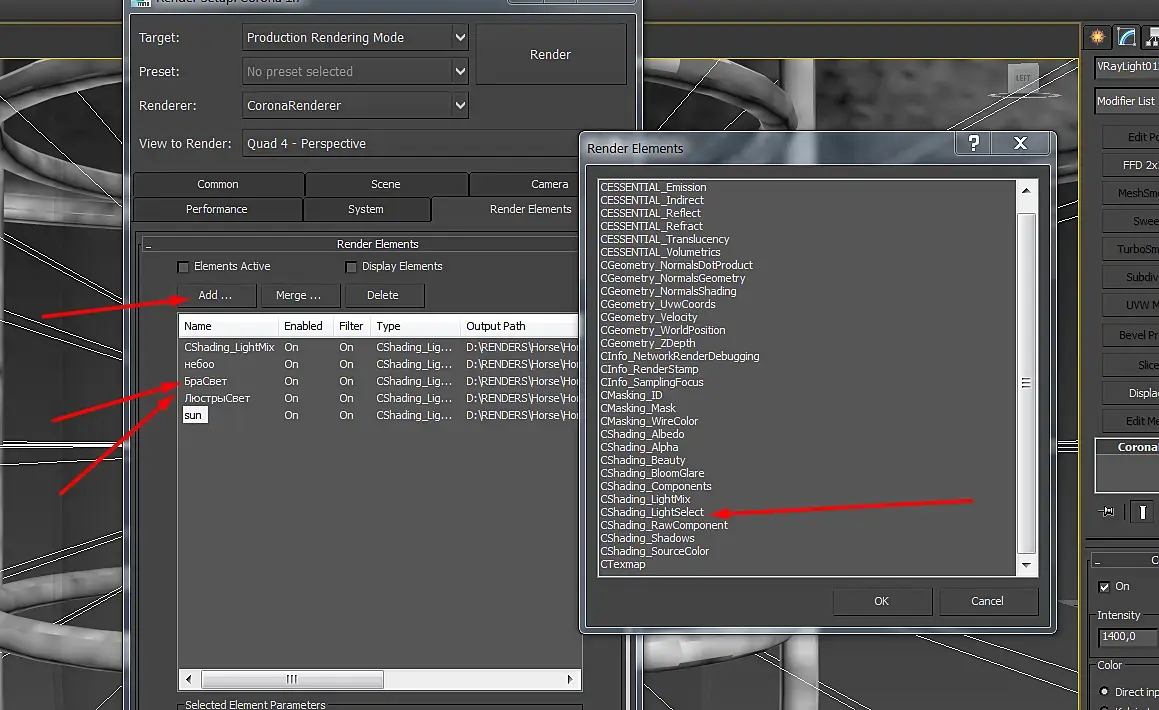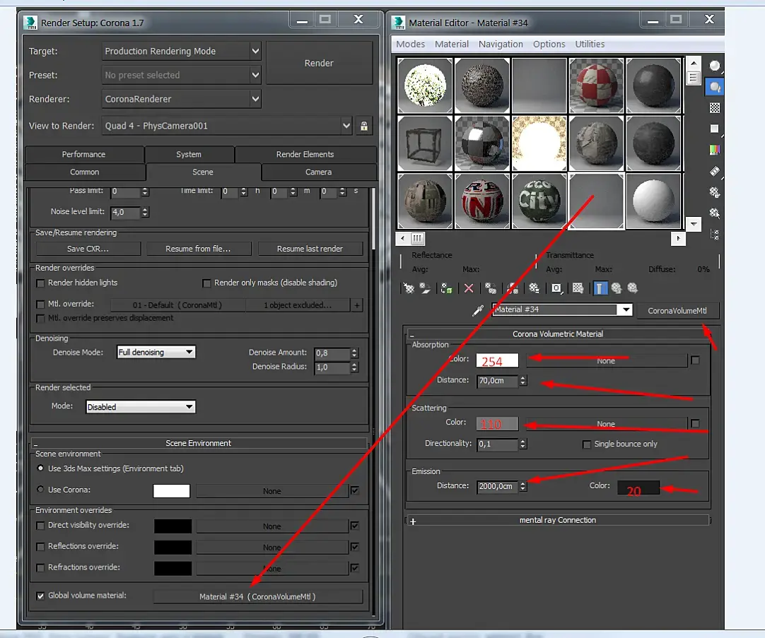 Следующий этап это построение объема. От большего к меньшему не особо задумываясь о деталях.Строим каркас конюшни , расписывать процесс моделинга я не буду скажу лишь то что для создания досок используйте FloorGenerator. Причем 80% того что есть на данном скрине сделано именно им FloorGenerator- работает очень просто и я думаю его используют практически все визуализаторы так что нет смысла в рассмотрении данного плагина. Вот мы наконец то набросали объем и возникает вопрос а что собственно дальше? Вариантов не много, можно моделировать детали и наполнять сцену либо уже начинать ставить свет. Я предпочитаю свет настраивать в начале проекта и периодически вносить коррективы. И так мы работаем в Короне а значит процесс постановки освещение прост.Нам не надо расставлять порталы, не надо крутить кучу настроек и тестить часами добиваясь нормального результата. Просто ставим CoronaSun и жмем на кнопку Добавить Корона Скай в ОкружениеПараметр Size делаем по вкусу у меня в данном случае 8. Но в экстерьерной сцене это было слишком много и я его снизил до 2. Второй этап это настройка ЛайтМикса .Жмем F10 и в закладке Scene нажимаем Setup LightMix.Все вы настроили))) В элементах появились слои с Небом и Солнцем.Так как я делал проект в Короне 1.6 то использовал PhysCamera а значит Макс установит по умолчанию свою экспозицию и вы не сможете изменять ее так как вам надо. Просто отключаем ееДелаем тестовый рендер и получаем такое Шум, засветы смотреть больно)))) А значит нам надо все это настроить. Включить Денойз, настроить экспозицию и выставить все параметры так как подсказывает интуиция. По сути нет идеальных настроек на каждый случай. Всегда надо потратить время на поиски подходящей комбинации))) Но есть те параметры с которых можно начинать.Немного доработав геометрию( добавил ворота на входе) делаю очередной тест и настраиваю все параметры кроме LUT Curves и BLOOM к ним мы вернемся позже. И так....Объем есть, свет есть но нет Крастоы)))Все плоское, бездушное.Давайте добавим воздуха. Добавляем в редактор материалов CoronaVolumMtlи перетаскиваем в GlobalVolumMtlПараметров универсальных по сути нет.Все зависит от сцены,экспозиции и освещения.У меня получились именно такие настройки. В экстерьерной сцене они другие, в подвале тоже хотя подвал в этой же сцене. Считаем....Дымка есть, объем есть а красоты нет)))) Но мы руки не опускаем. Что нужно для хорошей картинки ? Правильно детализация и освещение. Значит добавляем деталей и ставим свет.Сено пока не трогаем, расставляем модели примерно так выглядит результат Если с деталями все ясно то с ИС надо разобраться.Часто люди в Короне используют Лайтматериал как ИС и это ошибка. Первое в чем проблема это шум, вторая проблема это гибкость.Нам надо Люстры и бра сделать красивыми, а значит сделать им спираль в лампочке но освещать должен обычный ИС.Сам ИС должен быть чисто белым. Возникает вопрос почему же белым? А дело в том что мы будем в ЛайтМиксе менять цвет и переносить его на ИС. Так же выключить ему отражения, и тени.Вот параметрыРасставляем все ИС, разбиваем на группы и в ручную вносим в ЛайтМикс Теперь с помощью Лайтмикса настраиваем освещение .Яркость,цвет после чего желательно с помощью кнопки Scene перенести все в слой BEAUTY (когда закончите настраивать)Далее переходим в закладку Post и добавляем штрихов.Опять же тут все по вкусу и по ситуации. LUT выбираем банальным