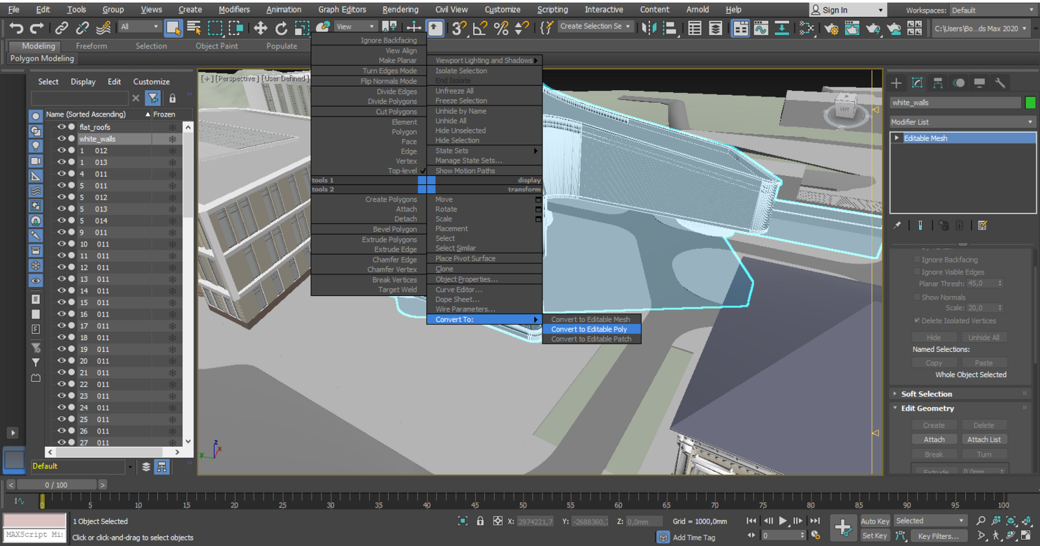 Теперь начинаем исправлять сами объекты, импортированные из архикада. Для удобства работы в будущем, я советую дать нормальные названия всем объектам, а также конвертировать их в «Editable Poly». Переименуйте все свои объекты с названиями «1 0002» и т.д. в что-то такое: «glass», «concrete», «black frames». Так вы сразу будете видеть, где нужный объект, если будете выбирать его через «Scene Explorer».