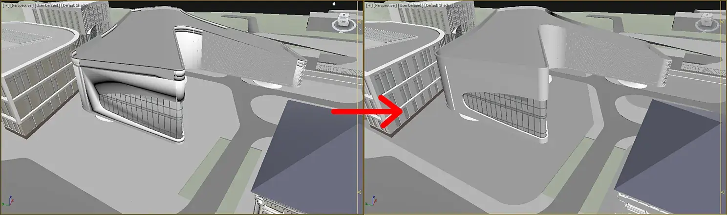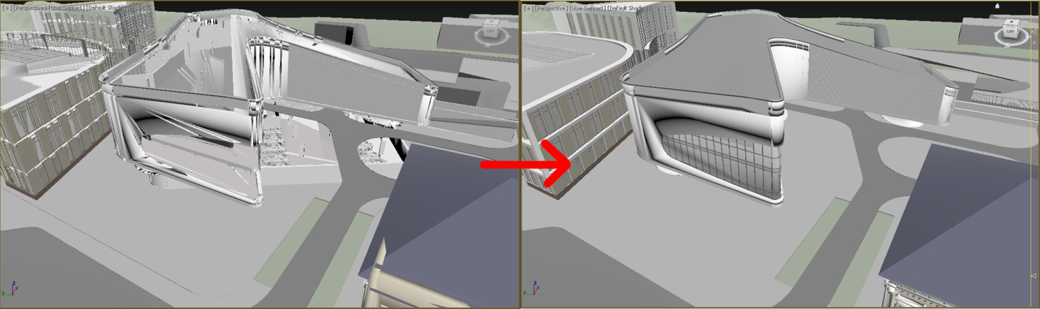 Стандартный способ перекинуть модель из архикада в макс — открыть 3д вид и сохранить файл в формате 3ds, потом открыть Макс и импортировать его. Ну, вроде бы всё, но есть нюансы.При сохранении 3ds из архикада нужно в параметрах задать единицы 1000 мм, а группировку выбрать «Строить объекты 3DStudio согласно… Покрытиям». В таком случае модель, при открытии в максе, разделится на несколько объектов с одинаковым покрытием — например, все стекло здания будет одним объектом и его будет удобно редактировать. Также этот вариант наименее глюченный, попробуйте сохранить в других режимах, сами все поймете.