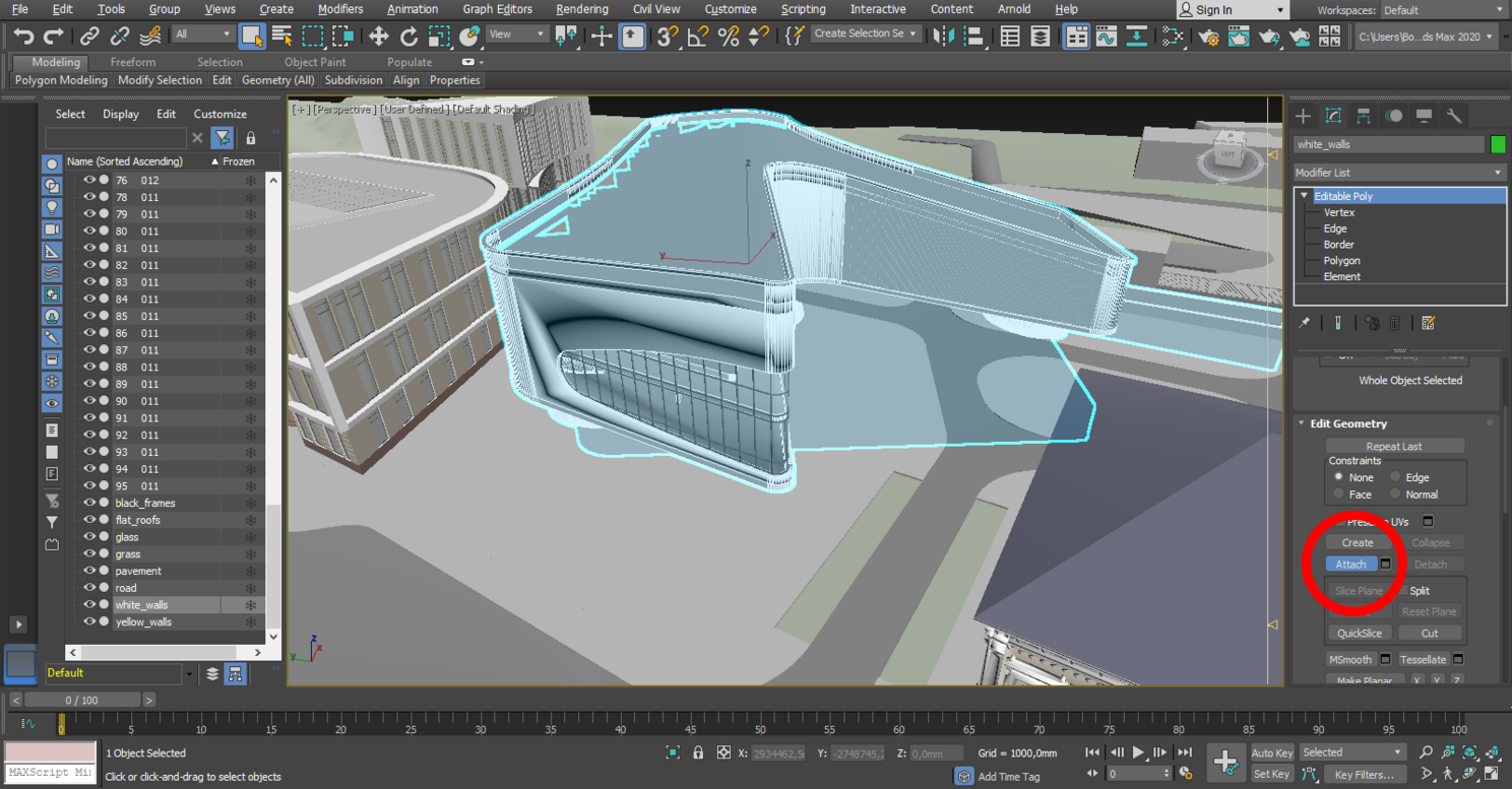Также, нужно объединить объекты с одинаковым материалом в один — они иногда разделяются на несколько объектов при импорте из архикада, это случается, если у вас большой объект с большим количеством полигонов. В «Editable Poly» ищем кнопку «Attach», нажимаем и выбираем объекты, которые нужно присоединить к текущему выбранному объекту.
