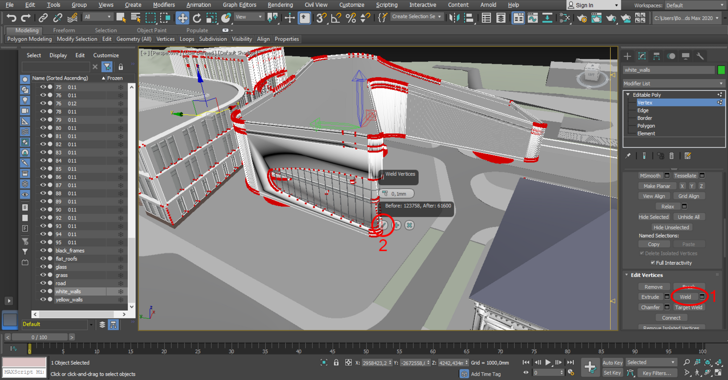 Теперь склеиваем вершины внутри каждого объекта. Это необходимо для того, чтобы полигоны внутри объекта объединились в элементы и вершин стало меньше, это облегчит модель, и даст вам возможность выделять объекты здания, не нажимая на каждый полигон. Заходим в режим редактирования вершин внутри «Editable Poly», выделяем все вершины с помощью сочетания клавиш «Ctrl+A» и нажимаем кнопку «Weld». После этих операций, некоторые вершины расположенные на расстоянии 0,1 мм друг от друга будут склеены.