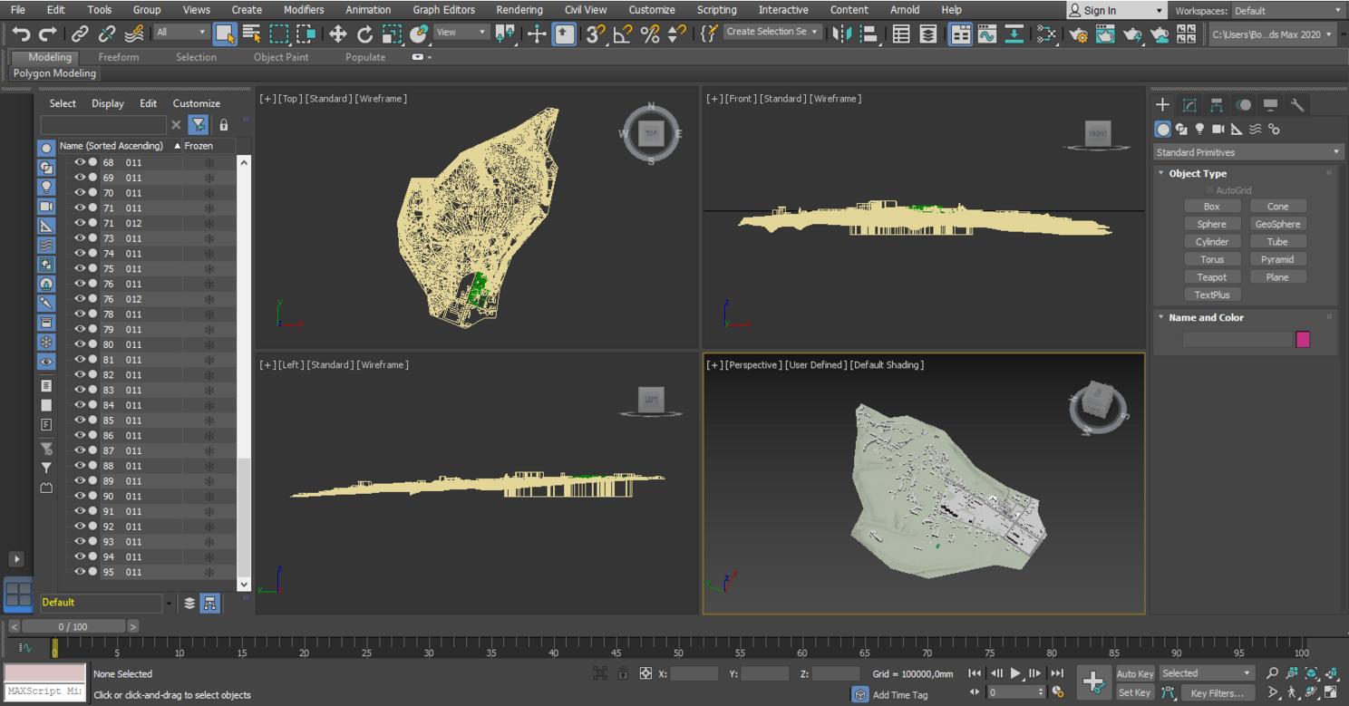 Сразу после импорта наше здание находится неизвестно где, куча непонятных объектов в списке слева