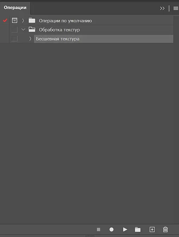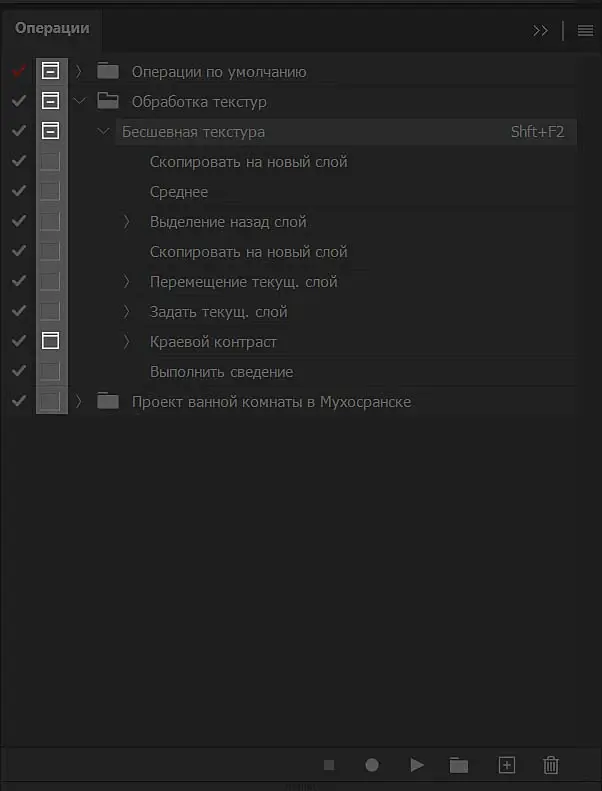 В верхней части окна есть меню, в котором повторяется часть видимых в окне функций, экспортируются и импортируются ранее созданные операции, выбор встроенных операций и др. Фактически, для наших задач оно не потребуется. Ниже расположен каталог, который мы можем редактировать на свое усмотрение – удалять лишние папки, создавать новые, перемещать операции из одной папки в другую, простым перетаскиванием. В самом низу панели расположены кнопки управления операциями (слева – направо): стоп, начать запись редактирования операции, запустить операцию, создать папку, создать новую операцию, удалить выбранное.