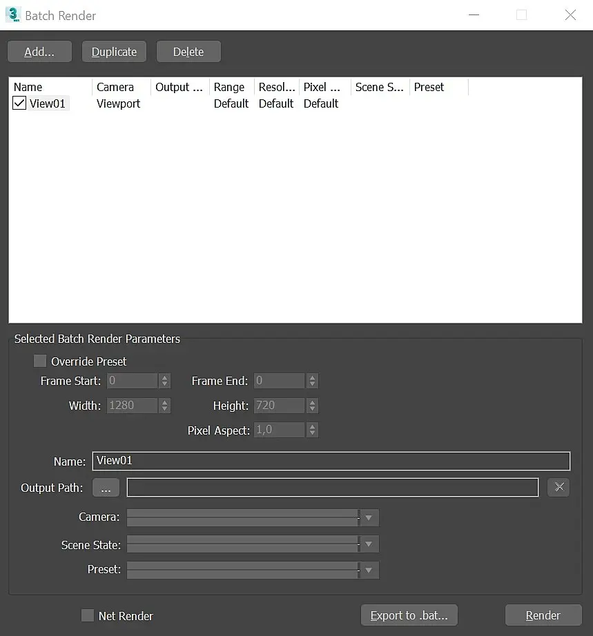Batch Render – это пакетный рендер, встроенный в 3ds max, который, после некоторой настройки, позволяет запустить рендер со всех выбранных камер. В верхней части окна настройки, с помощью кнопок Add… Duplicate и Delete мы добавляем, дублируем или удаляем задачу (будем называть это задачей, что бы вы не путались с настройкой самой камеры), которые будут отображаться в окне ниже, где мы имеем возможность поставить галочку напротив нужных нам задач или наоборот выключить их.