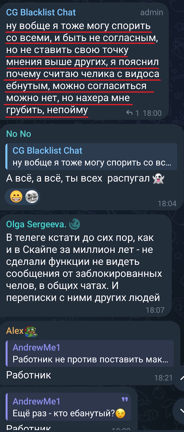 Уже после моего бана начальник сия цеха решил выйти к своим кривозубым крестьянам и сообщить, какой он великолепный и правильный, а грубить ему нельзя. А вот ему называть всех несогласных "еб*нутыми" - можно, т.е. буквально он живёт и мыслит по системе "я начальник, ты дурак" - днём он дурак в офисе, потупивши глаза смотрит в пол и не может ничего возразить, а вечером отрывается в своём канале, потому что здесь он большая и важная пися. И там ему никто не возразит!