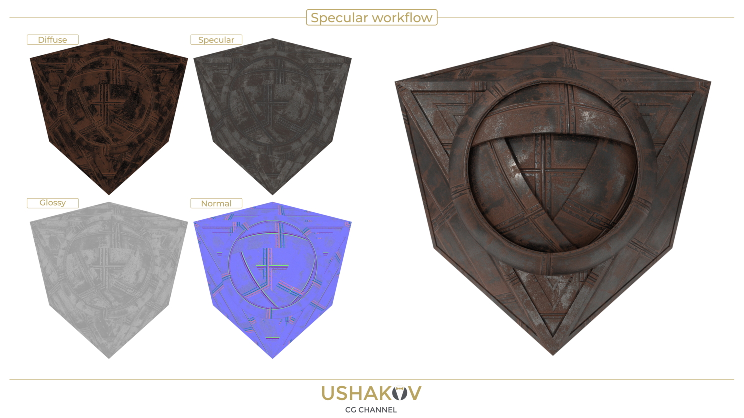 Для рабочего процесса Specular workflow — диффузная карта «закрашивается» черным в тех местах, где поверхность должна проявлять «металличность», там же, где поверхность является диэлектриком, задается необходимый цвет. Через текстурную карту Specular задается степень зеркальности объекта для диэлектрических участков через оттенок серого, а для металлических участков через необходимый цвет металла.