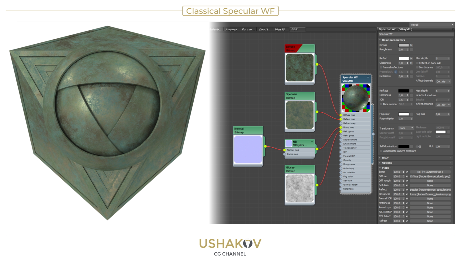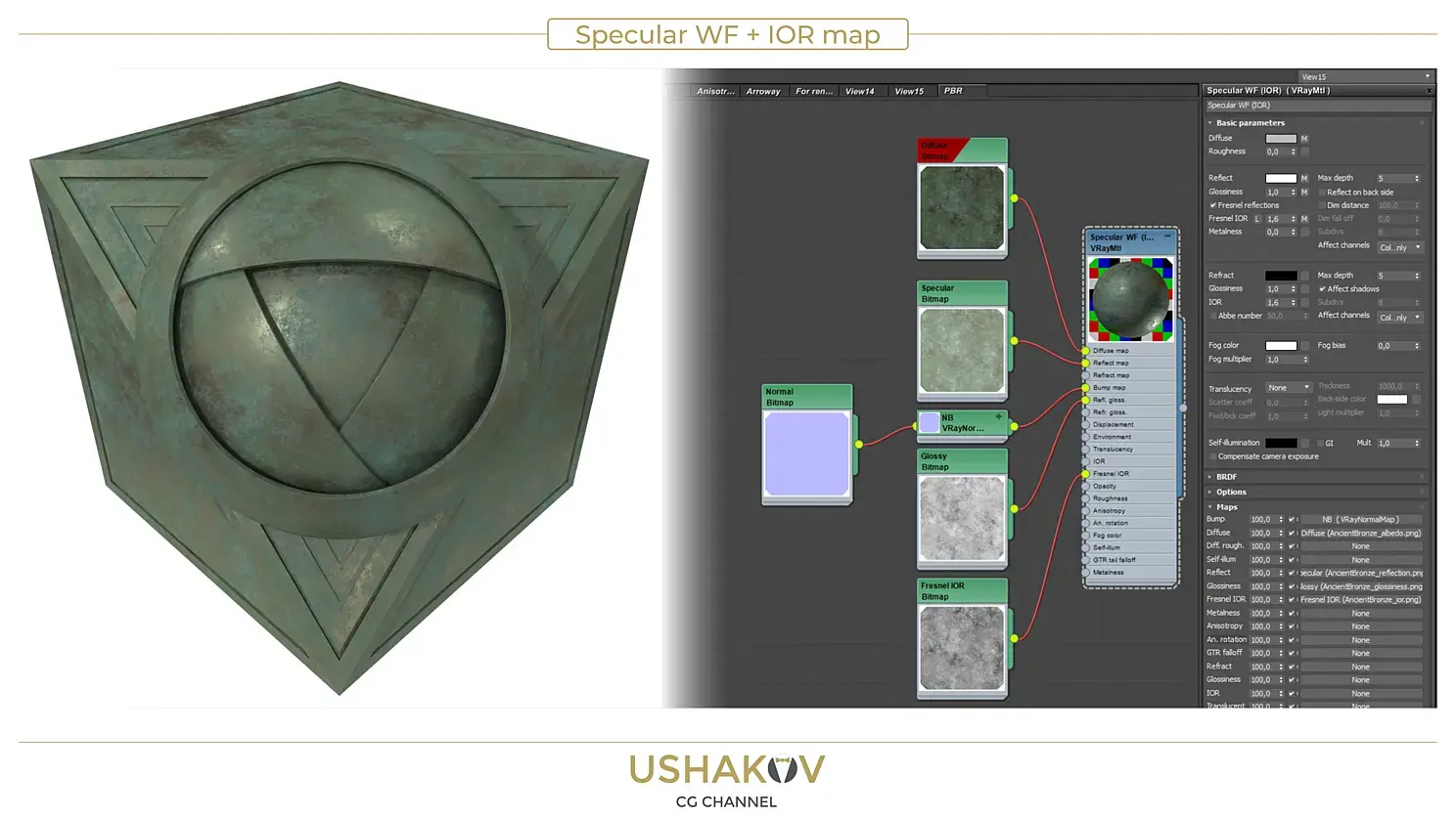 Некоторые ресурсы предлагают адаптированный к V-ray сет для Specular workflow. В этом сете есть дополнительная IOR карта, которую нужно подключать к слоту Fresnel IOR и так же немного измененная по цвету Specular карта. Такое решение делает шейдер более корректным и отвечающим принципам PBR.