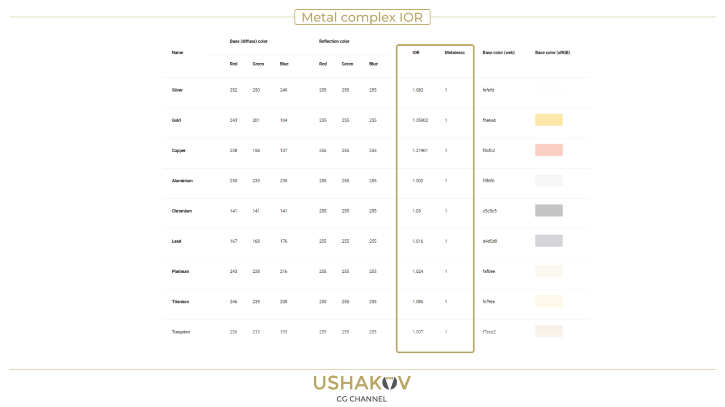 Этизначения, в большинстве случаев, чуть больше единицы. Но как раз из-за этого что IOR метала значительно ниже значений у неметаллов, то имеет смысл заморочиться над этой разницей, для достижения максимальной реалистичности и физической корректности шейдинга в режиме Metalness workflow.