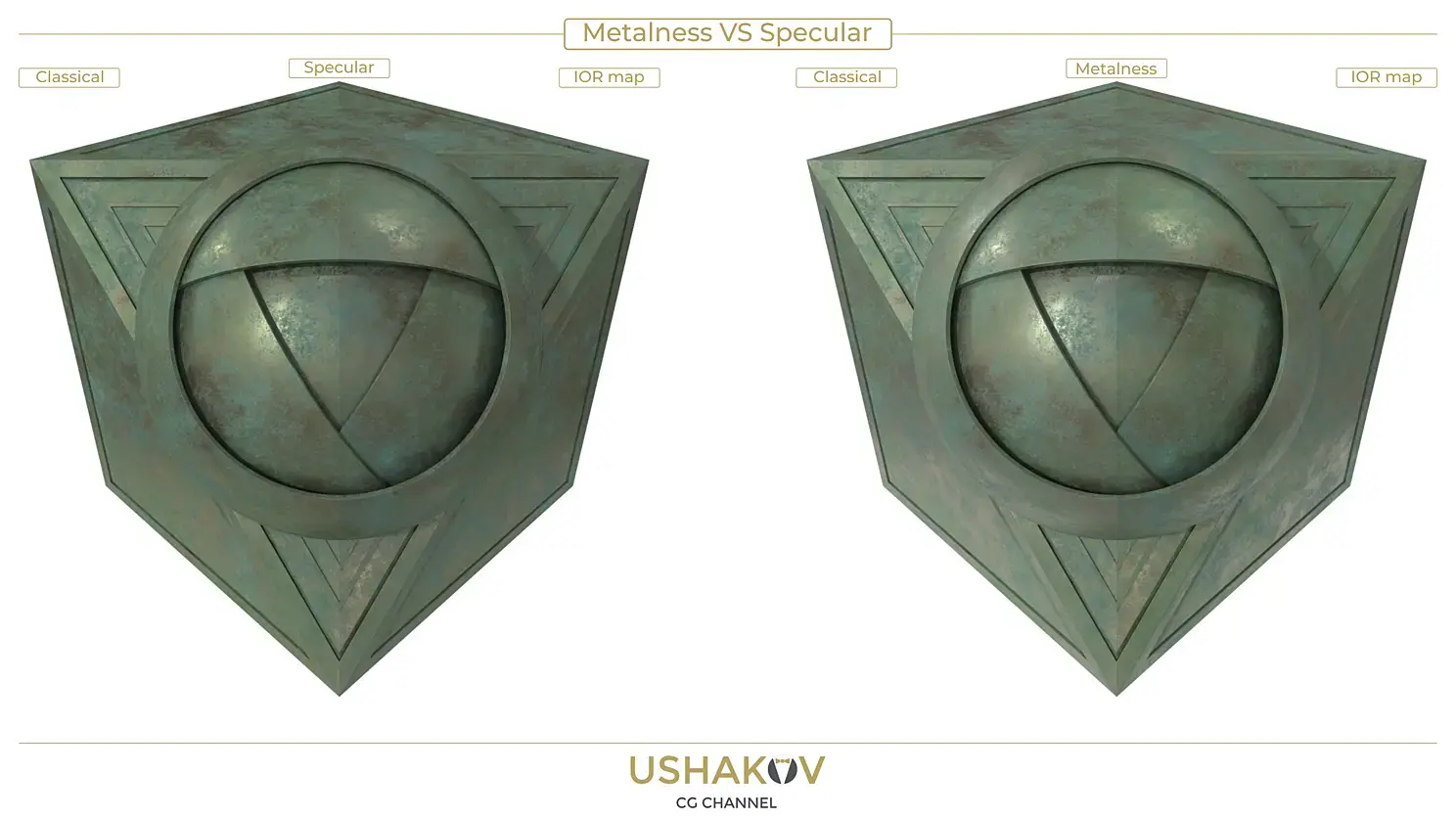 Есть два шейдерных решения так или иначе поддерживаемых в большинстве рендер движков — Specular workflow и Metalness workflow. Эти решения отличаются набором необходимых текстур и соответственно слотами размещения. Итоговая разница не существенна, но заметна в ряде деталей. Забегая вперед сразу скажу, что Metalness workflow более удобен, более экономичен в расходовании видеопамяти (актуально для игровых движков), прост и поэтому стал теперь доминирующим рабочим пространством.