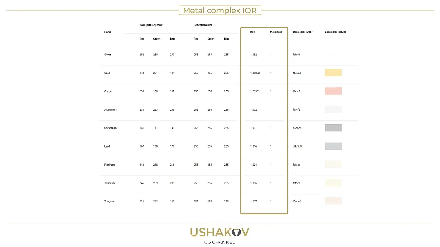 В статье Understanding metalnessвы можете найти табличку, скриншот которой представлен ниже, Vlado (папа V-ray) вычислил комплексные значения IOR для ряда металлов которые можно\нужно использовать в совместно со включенной опцией Metalness.