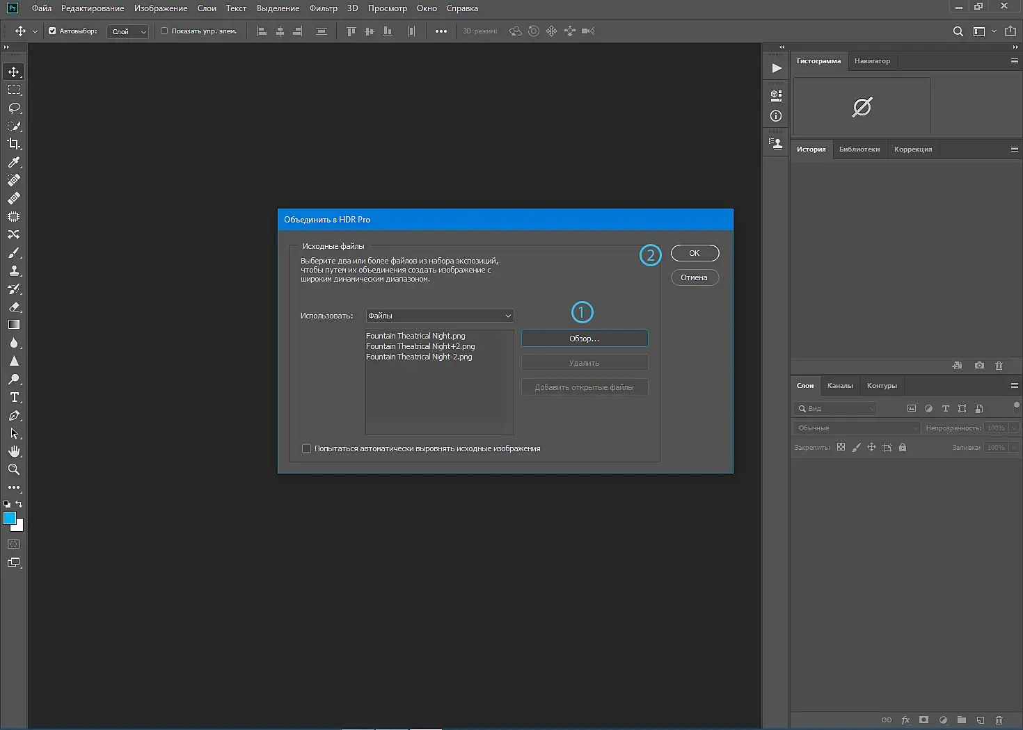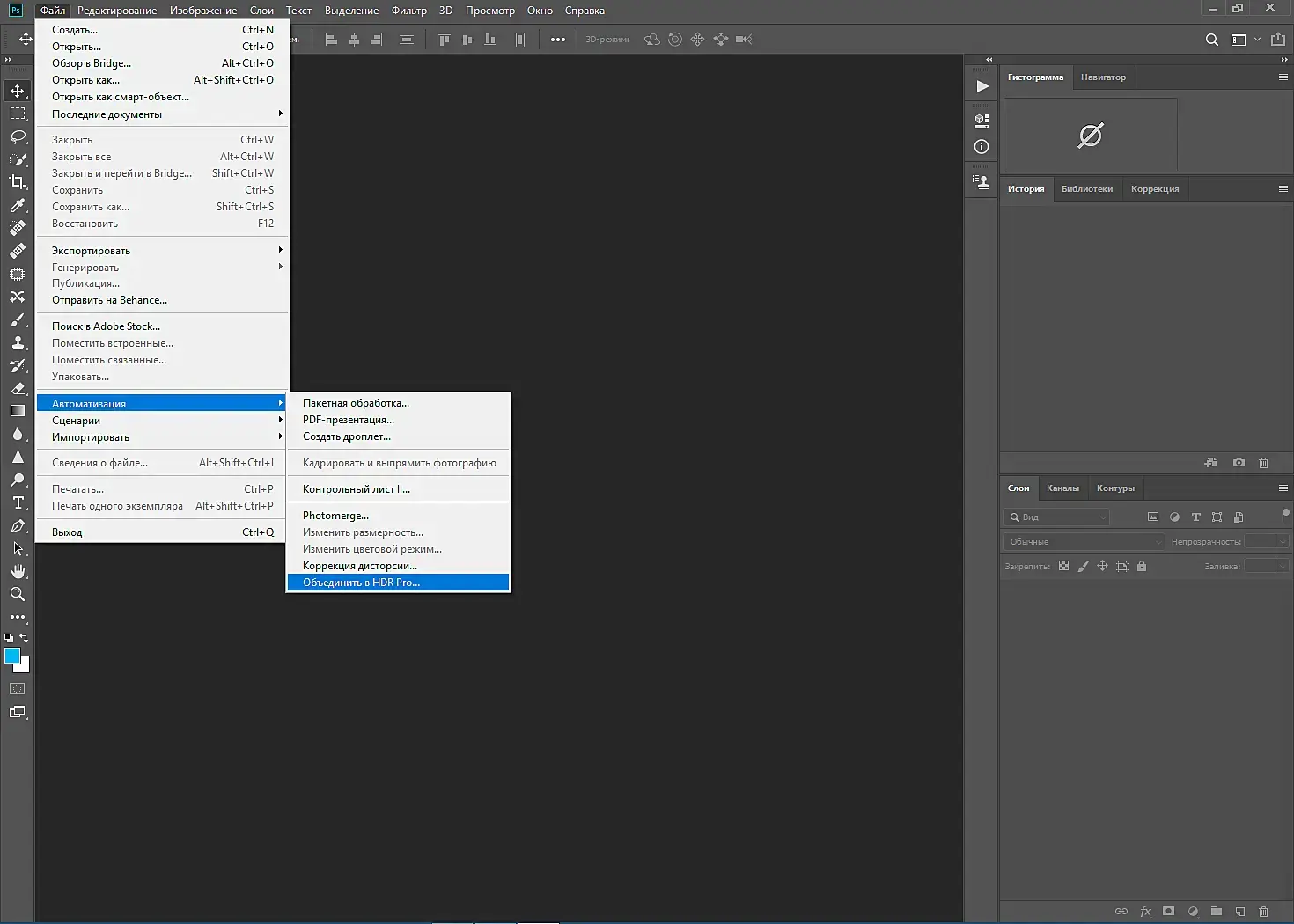 В Photoshop идем Файл\Автоматизация\Объединить в HDR Pro.