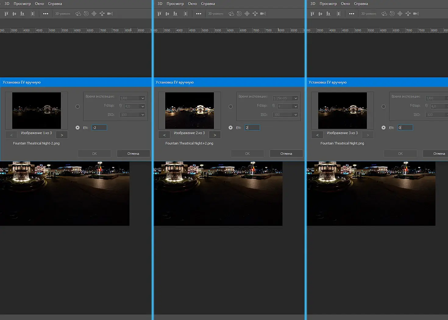 Получились три файла с разными экспозициями -2,0 (исходная панорама),и +2.Их надо объединить.