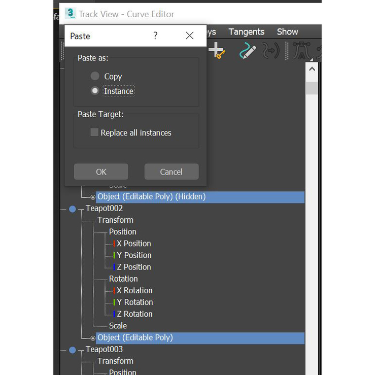Что нам надо. Выбираем один объект как оригинал, далее идём в Track View – Curve Editor это панель для анимации.
