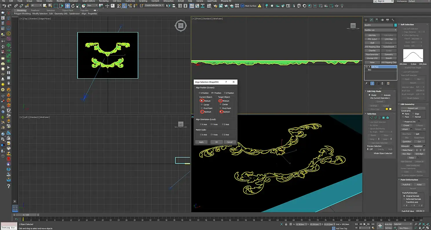 10. Выравниваем так, чтобы верхняя часть "фрезеровки" была вровень с верхним полигоном бокса. (Надо поиграть с Min и Max)