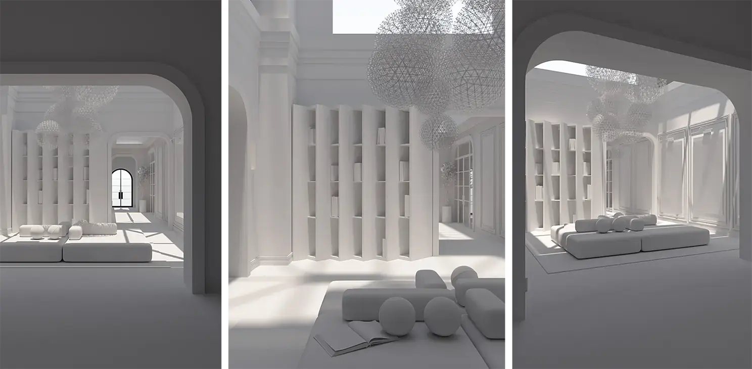 Сверяемся с референсами похожих помещений, убеждаемся что композиция получилась. Например на этом рефе хорошо работает перспектива и грани стремятся в одну точку схода.
