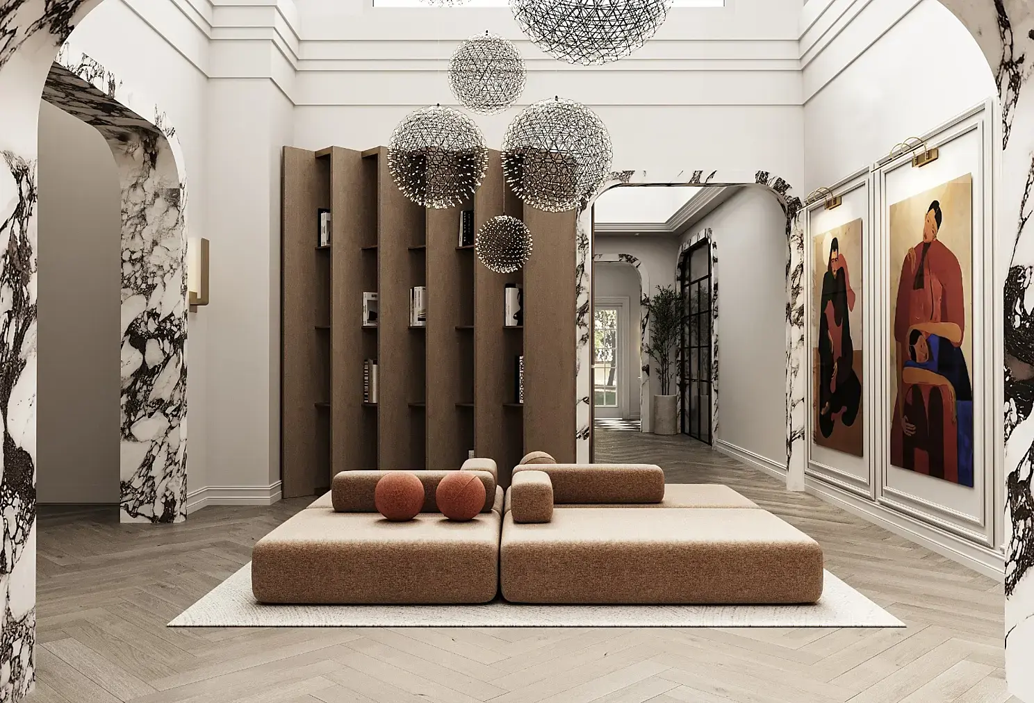 Даём довольно широкий угол камере для того, чтобы наши грани устремлялись в одну точку схода, зритель мысленно сам соединит их и кадр получится живым и интересным для просмотра. Также есть ритм который стремится вверх, большое пятно - пол и диван, дальше сужается шкаф и карниз, и оставим совсем узкую полоску от мраморного проёма в самом вверху. Этим приёмом мы ведем зрителя к окну наверху, а значит в нем тоже нужны какие то детали, которые уведут дальше взгляд.