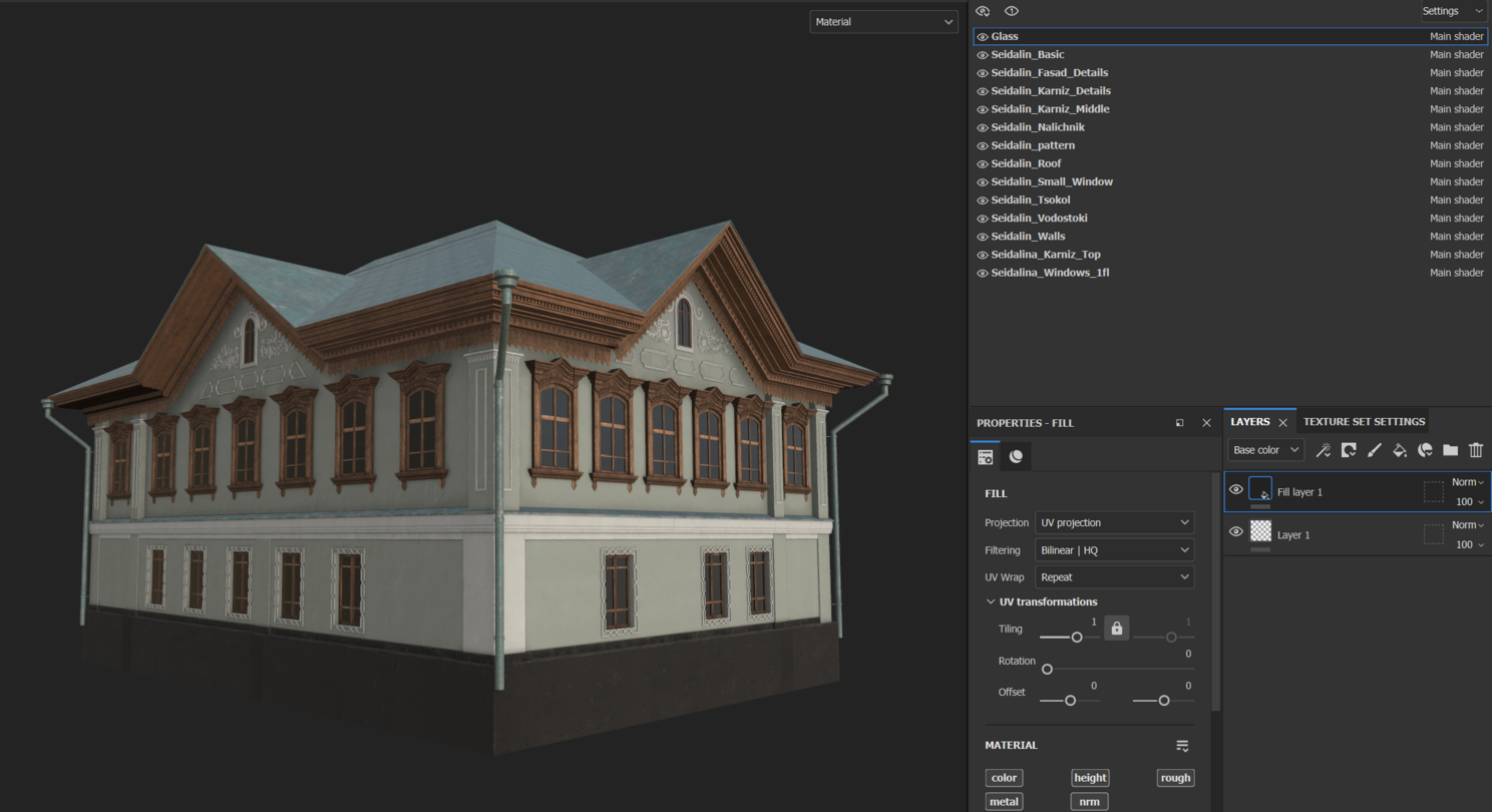Далее разбиваю моель по материалам, обычно это стены, окна, карниз, цоколь, и при необходимости по фасадам (левый, правый т.т.д.) Не упаковываю все в один атлас и два UV т.к. это сложноватый пайплайн для меня, проще контролировать отдельно по кусочкам.