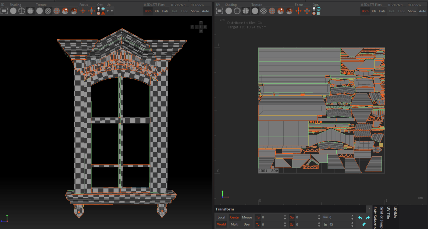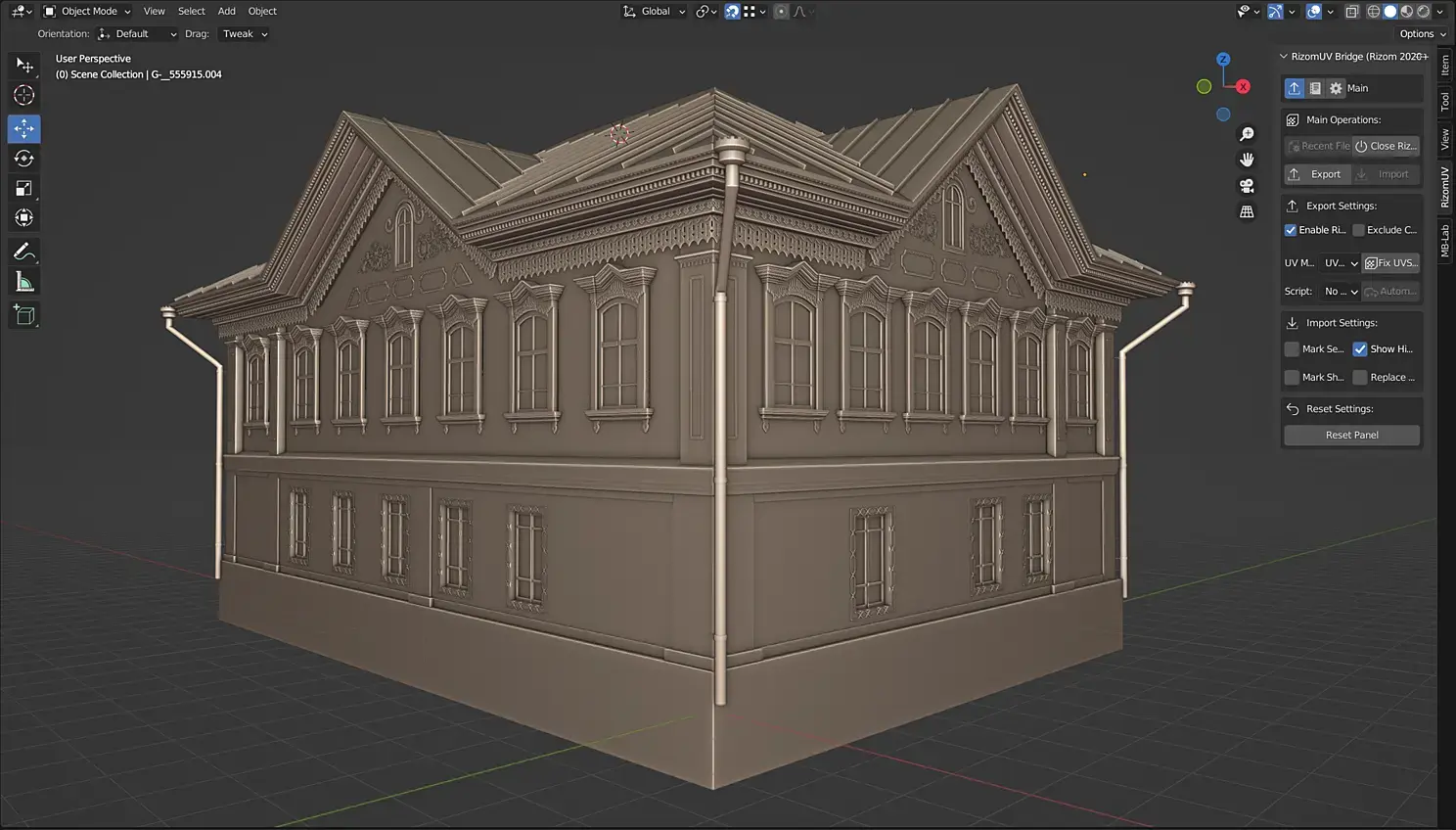 После этого уже в блендере я добавляю детали, карнизы, наличники, и всю остальную мелочевку. Опять же в основном из за сетки, котору потом отправляю в RizomUV через аддон в один клик. Мне кажется это очень удобным, хотя можно и в блендере развернуть нормально. Плюс RizonUV в том, что он понимает одинаковые элементы и это значительно ускоряет процесс развертки.