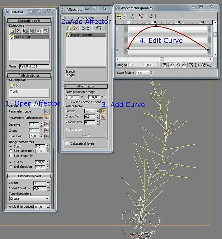 Убедитесь, что элемент «branch» выбран. Откройте «Affector control», (1) основанный на позиции ветви. Добавьте новый «Affector» (2) и выберите длину ветви, которую вы хотите контролировать. Добавьте кривые (3), и редактируйте кривые так как Вам нравиться (4). Смотрите предварительный результат во вьюпорте.