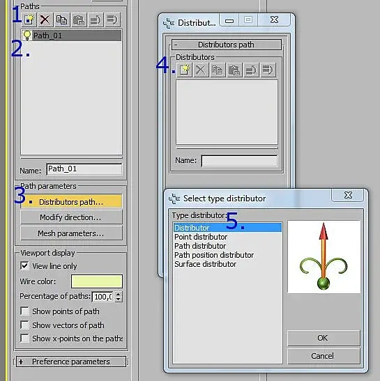 Основываясь на нашем стволе, мы начинаем добавлять дополнительные элементы. Создаём новый «Path». (1) Переименовываем в «Branches». (2) Создаём новый «distributor». (3) Далее выбираем «path distributor». Эта модификатор позволяет нам растить ветви на других «paths». Мы добавляем «root path» и выбираем наш ствол. (4) При переключении на «line display» (5), Вы должны будете увидеть свежесгенерировнные «paths».