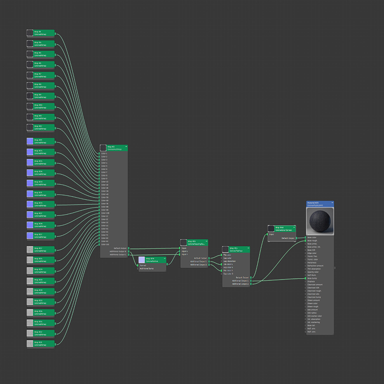 - - линковка всех трёх (тридцати нарезанных) текстур сразу в один CoronaMultiMap. Да, вы должны знать, что нужно пользоваться Additional Outputs, а не плодить их под каждый PBR-канал (как многие);