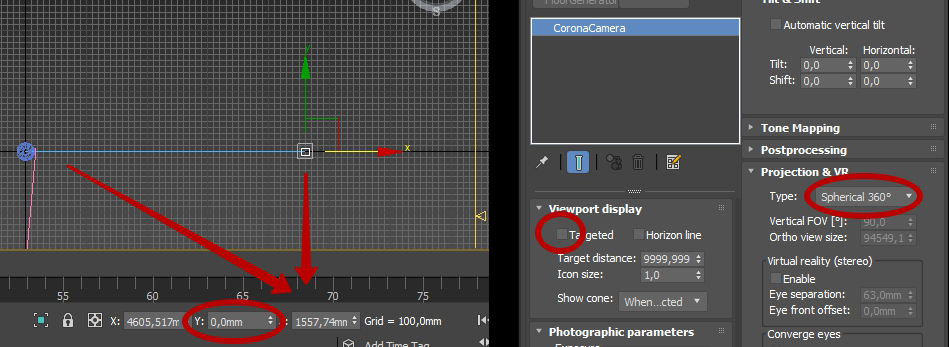 Далее настраиваем камеру: Переводим камеру в режим Spherical 360. Ставим Target камеры так, что бы он по Y был равен 0, а по Z (высота) был равен высоте, на которой стоит наша камера. Y выставляем в ноль для того, что бы рендер наших объектов совпадал с нашей панорамой при слиянии их в слоях при постобработке. Иначе придётся накладывать фрагментами.