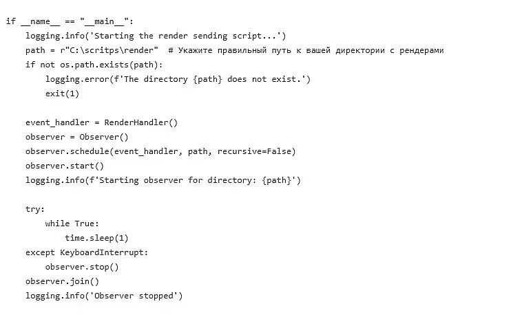 Как мы видим наш бот отозвался и мы получили chat_id. Теперь нам осталось написать основной скрипт отправки визуализаций. Работать он будет по очень простому принципу, мы создадим папку в которую мы хотим сохранить визуализации после рендера и запрограммируем скрипт с помощью библиотеки watchdog, который будет отслеживать все файлы с расширением .jpg в нашей папке и при появление их в нужной папке сразу будет оправлять их в наш телеграм бот. Так же создадим текстовый файл в который мы запишем следующий код и назовем его send_renders.py