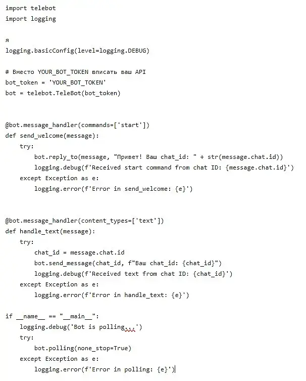 API мы получаем сразу после создания бота, а вот с chat_id немного сложнее. Для тех кто не знает как это сделать можно написать небольшой скрипт. Так же нам потребуются библиотеки telebot (устанавливается командой pip install pyTelegramBotAPI) и библиотека logging (устанавливается командойpip install logging). если кто не знает все команды вводятся в командной строке cmd.exe.