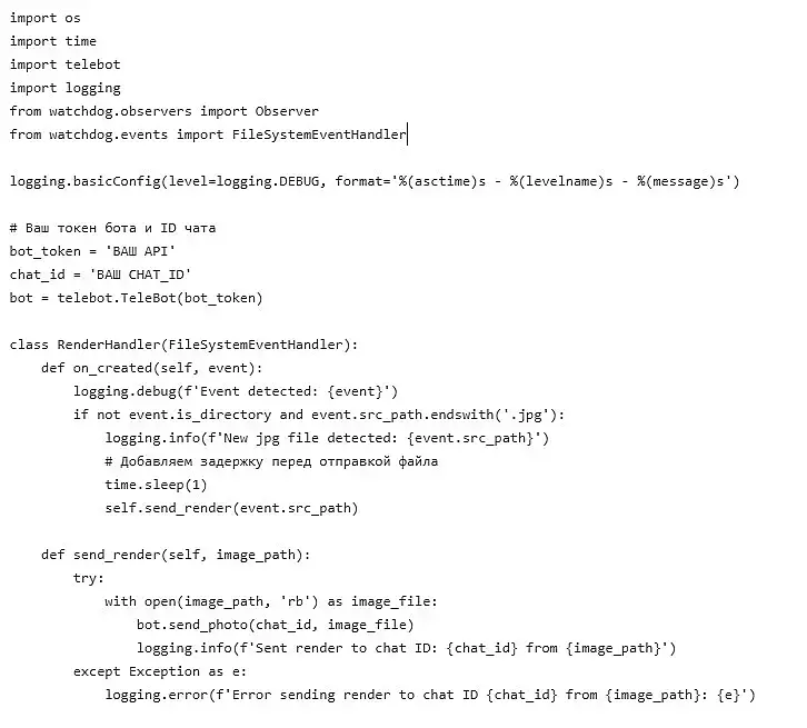 Так же не забывайте вписать ваш API, CHAT_ID и путь к папке с которой будут отправляться ваши рендеры.