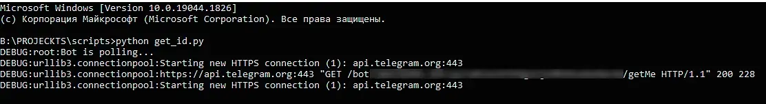 После того как напишите и сохраните код его можно будет запустить в cmd командой python chat_id.py и должно появиться такое сообщение в командной строке: