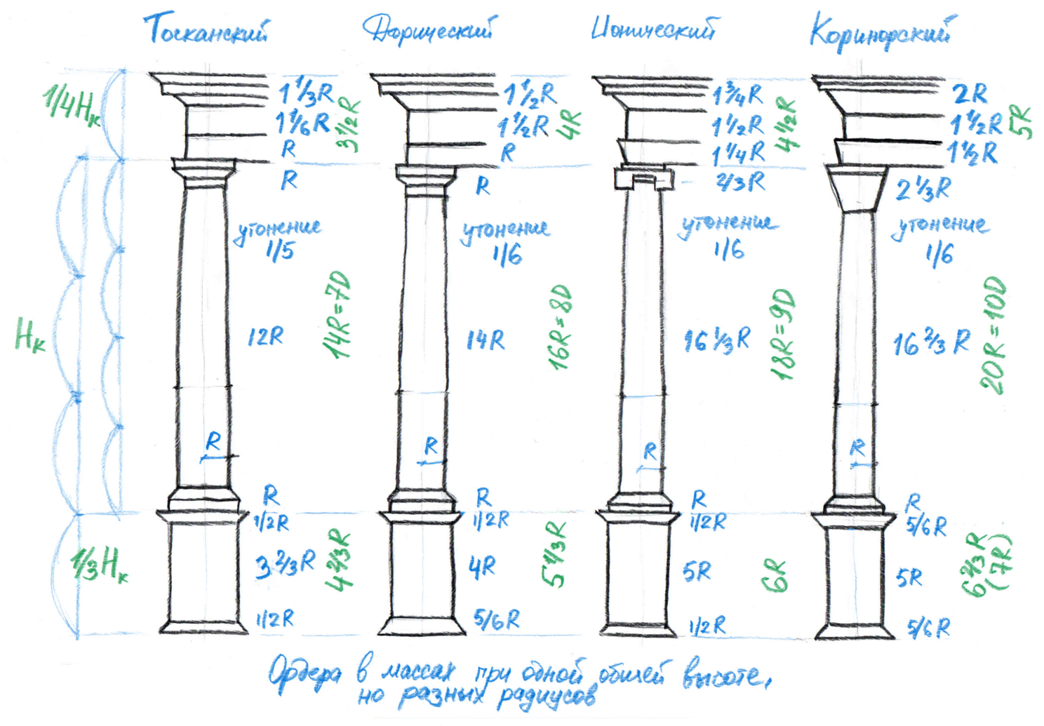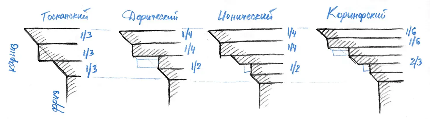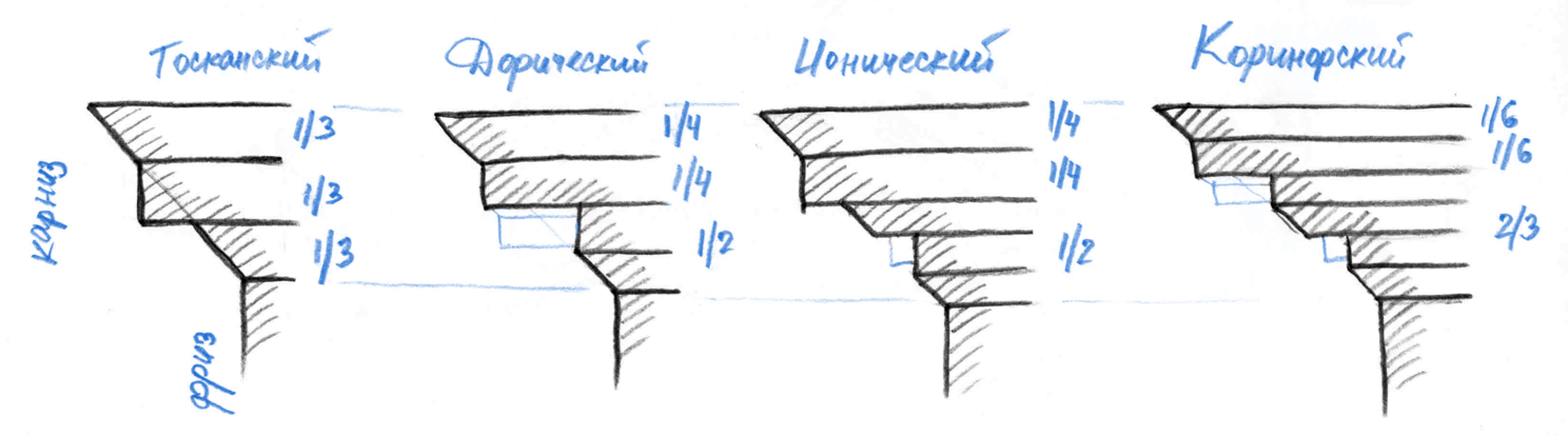 Напоминаю, эти соотношения даны Виньолой. А есть еще Палладио, Скамоцци и другие маэстро архитектуры, у которых эти соотношения отличаются, так что... фантазируйте и одновременно придерживайтесь норм)