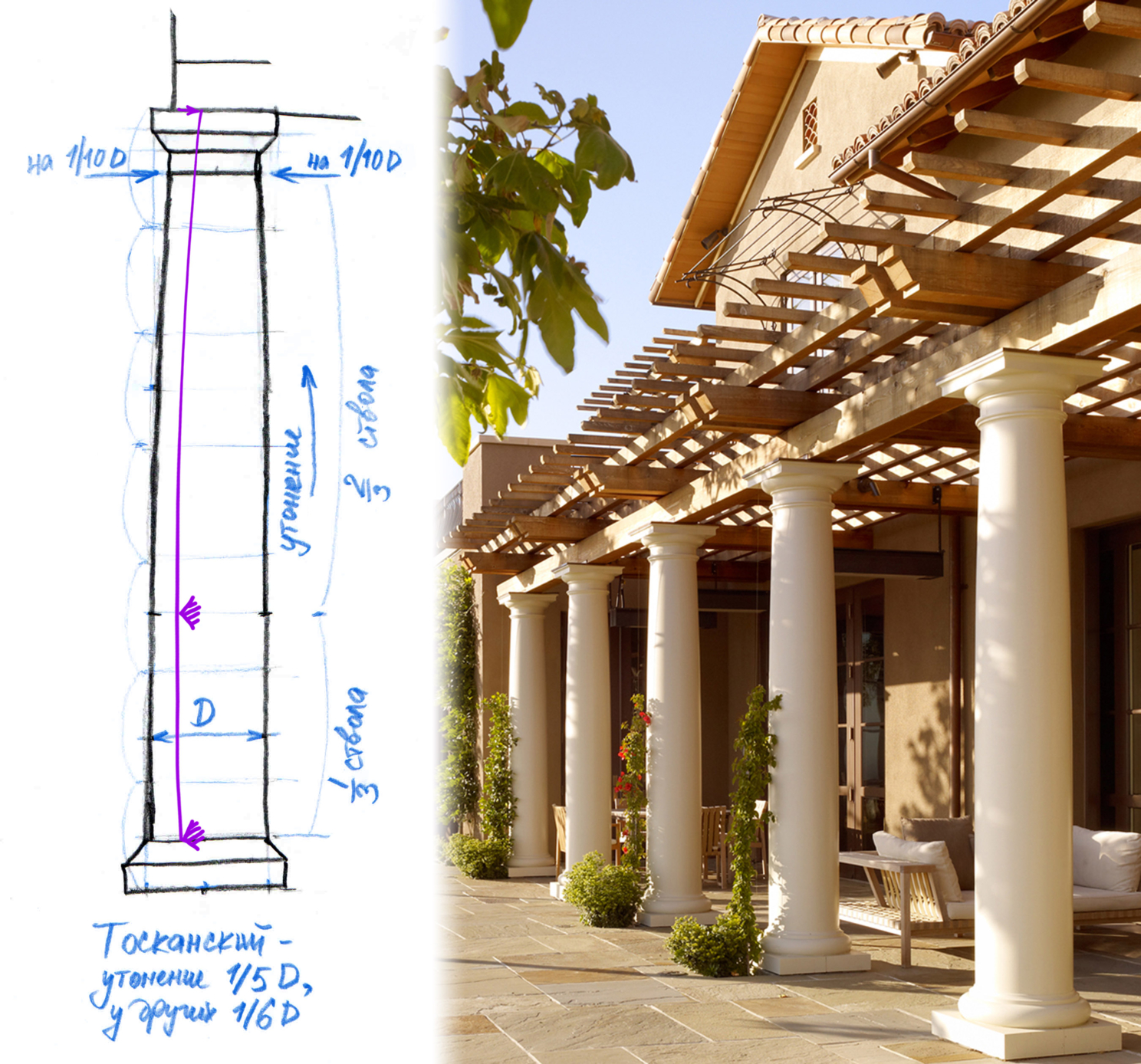 Необычный принцип построения: берём воображаемую тонкую гибкую металлическую линейку, приставляем нижний конец к низу ствола, верхний соответственно к верху, дополнительно имея точку опоры на 1/3 высоты, и легким нажимом смещаем верхний конец вовнутрь колонны, тем самым получаем плавную “припухлую” кривую (на иллюстрации в фиолетовом цвете).