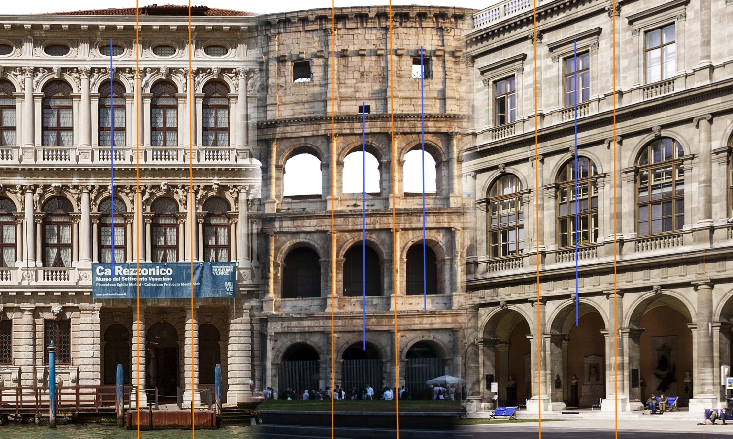 А правило соосности говорит о том, что колонны верхних этажей должны быть только под колоннами нижних, строго по одной оси. Таким же образом должны располагаться и проемы, т.е. окна, балконы и др. Всем известный пример – Колизей (посередине).