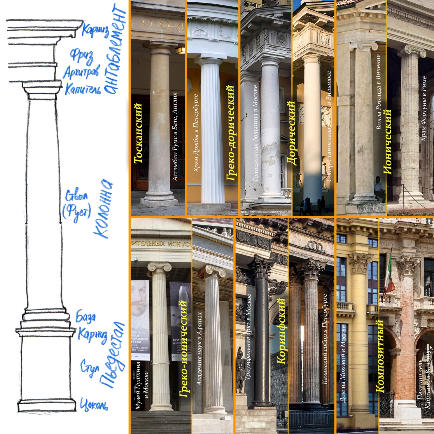 Для начала первая вступительная картинка, на ней показаны все разновидности ордеров и наименование основных частей. Без этих базовых названий и терминов сложно будет обойтись.