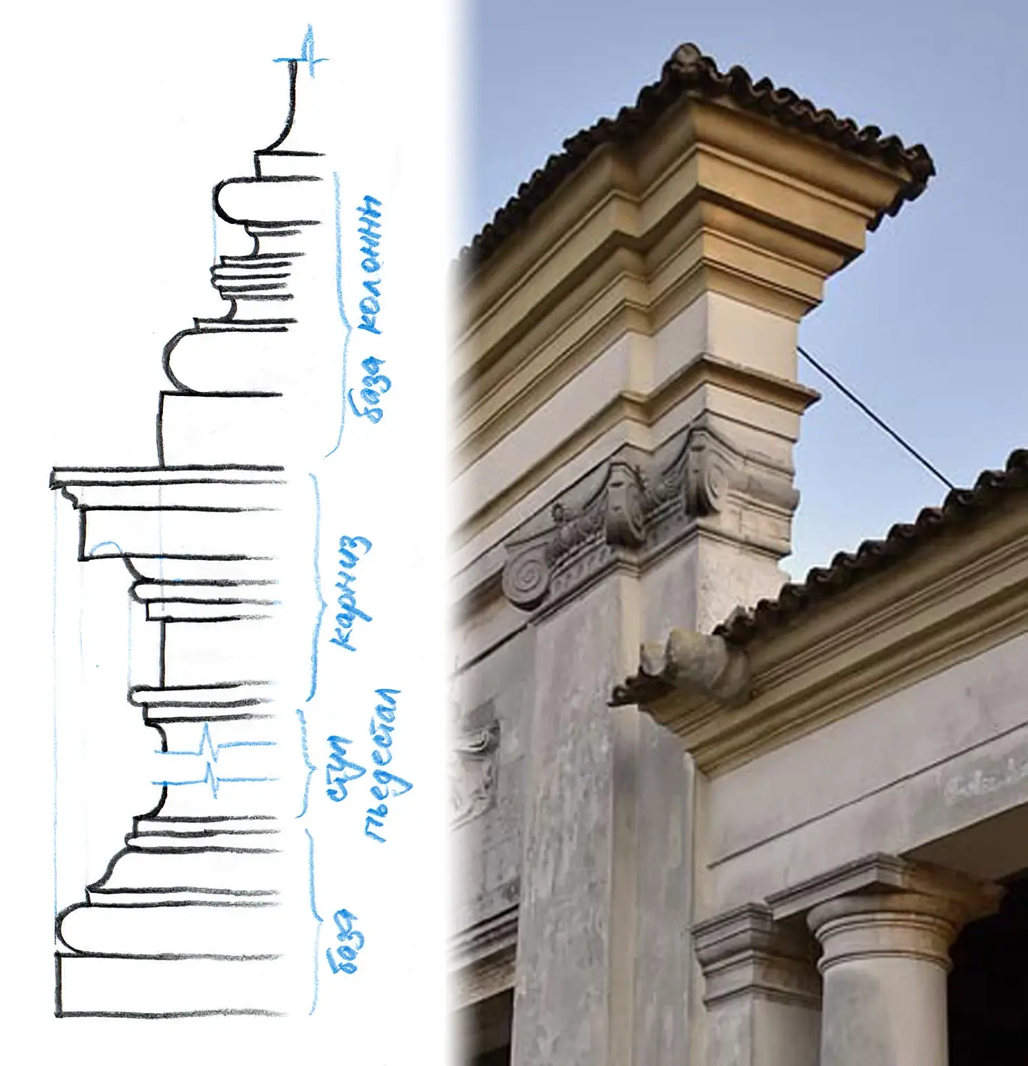 Карниз в свою очередь делится на поддерживающую (карнизную плиту), свешивающуюся и венчающую части. Карнизная плита имеет при себе маленькую выемку – слезник (от слова “слеза”), назначение которого преградить путь стекающей дождевой воде.
