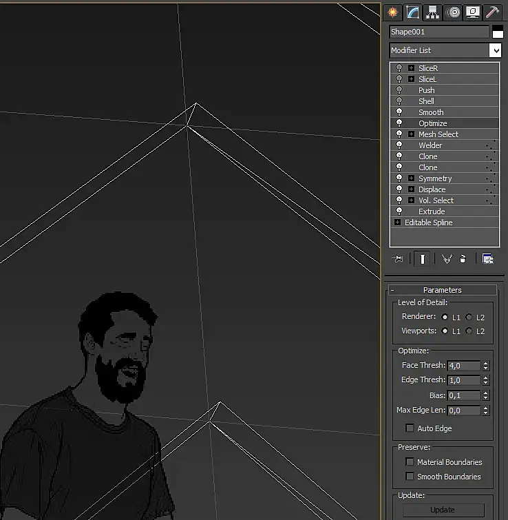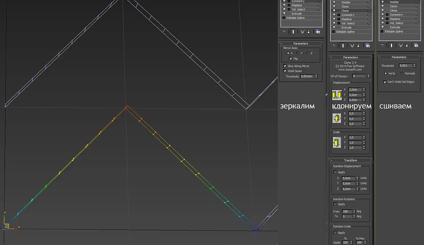 Всё, теперь по царски можно выдавливать и вдавливать. Следующие 3 модификатора, Symmetry - делаем зеркальную копию, оси симметрии по X на 10. Clone - как, вы еще не пользуетесь бесплатным и простым модификатором клонирования? Тогда немедленно качайте, не стесняйтесь гуглить "Clone Modifier 3ds max". Один клонирует по X второй по Y. Welder автоматически соединяет все близлежащие вертексы.