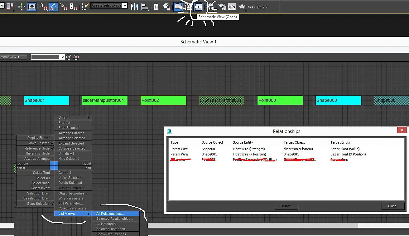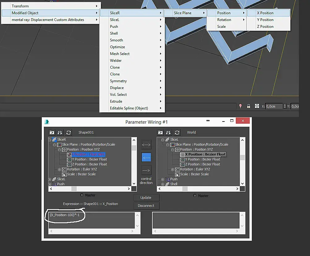 Вот он-слайдер моей мечты, но чего с него толку, подвигать ползунок можно, но он же ни на что не влияет, просто цыхарки. Надо их связать,чтобы это сделать, нам на shape001 надо клацнуть правой мышой, и добраться до Wire Parameter.