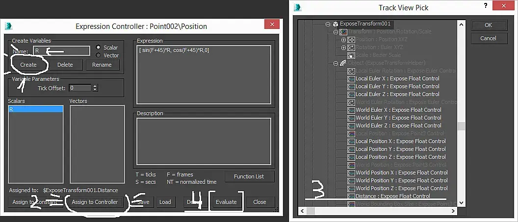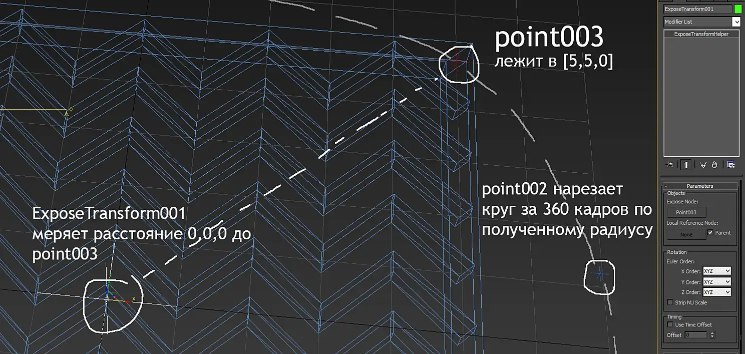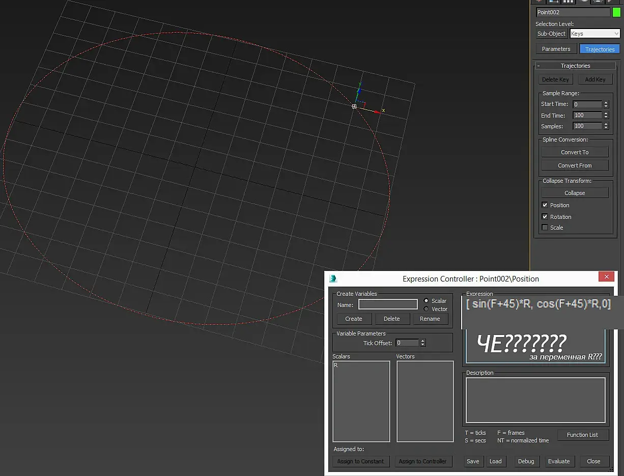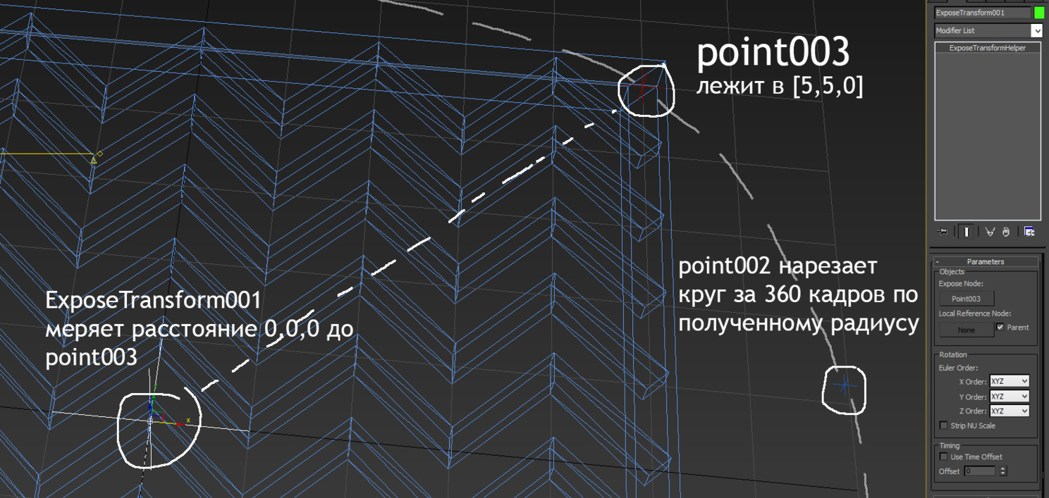 Синусы, косинусы... деградация... Если переменную F нам дарит Autodesk, то что за R, которая вроде как радиус окружности? Ну конечно, не вбивать же мне значение радиуса вручную, да еще по Пифагору, вычисляя гипотенузу, нафиг надо, я это значение получу из классного объекта ExposeTransform, что в хелперах прячется.